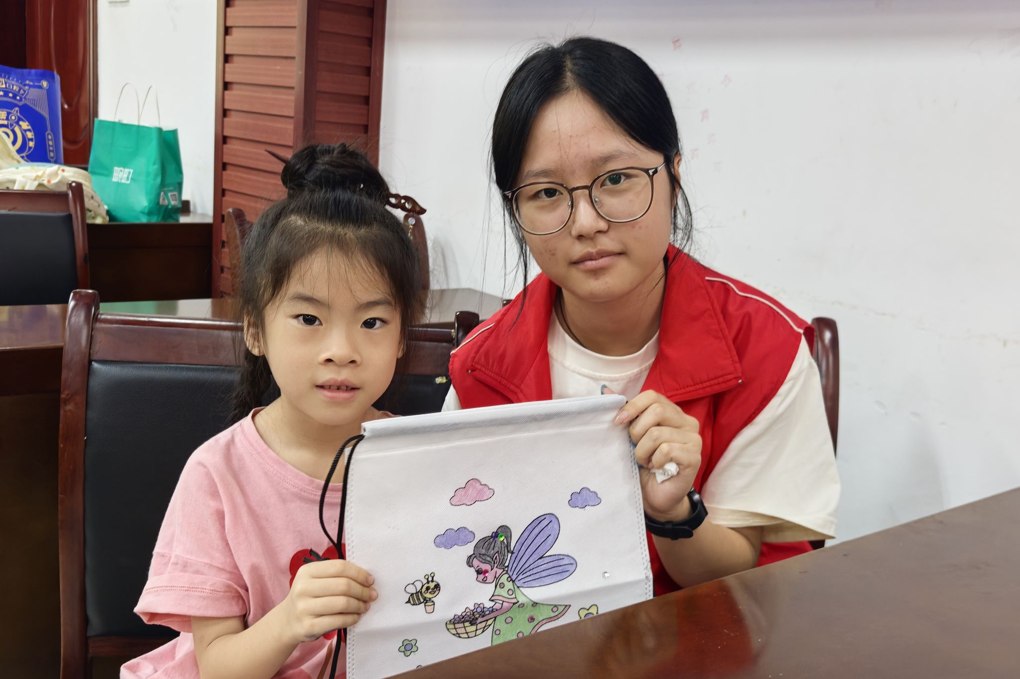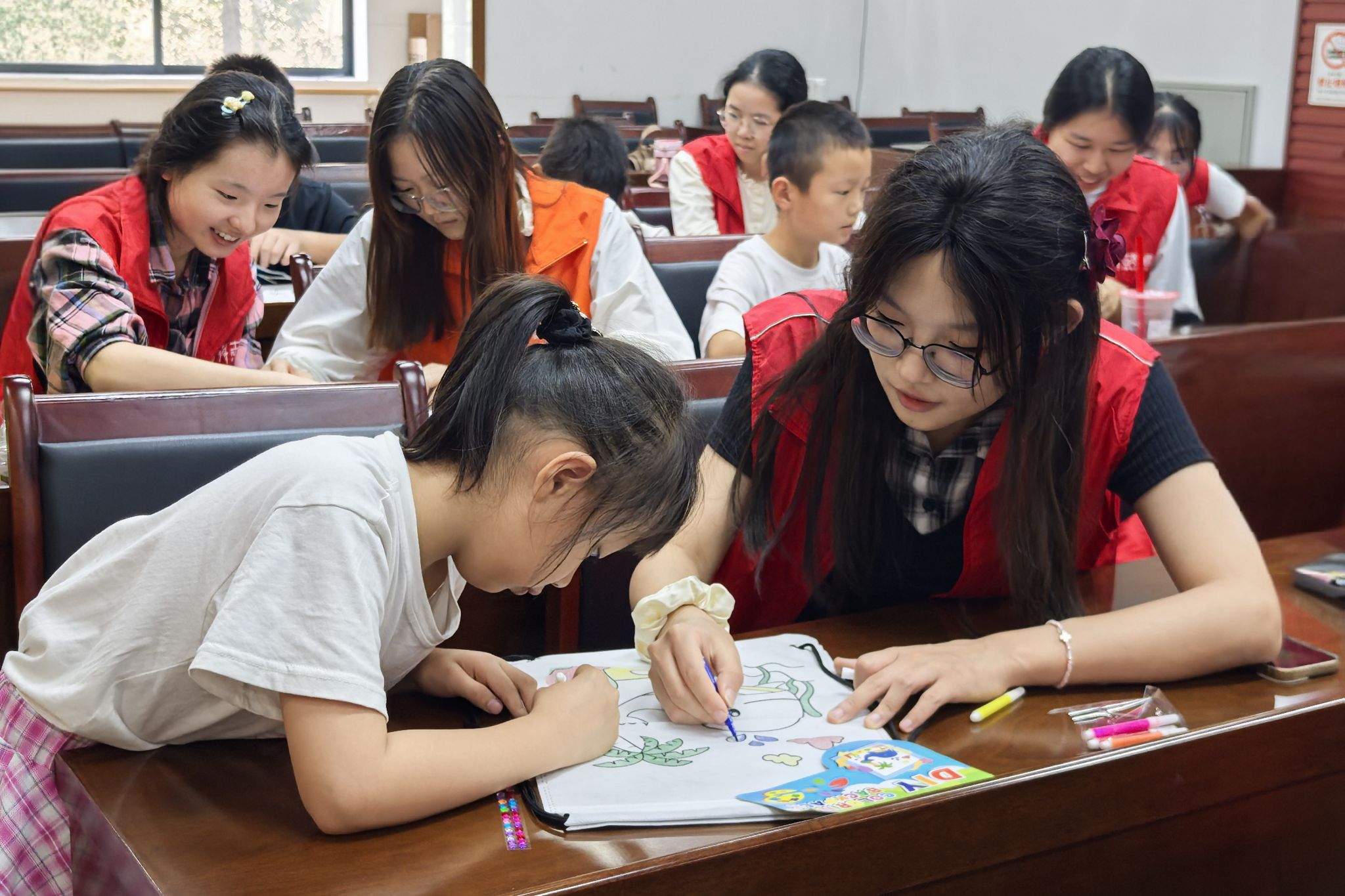 志愿者和小朋友合作在帆布袋上进行涂色创作