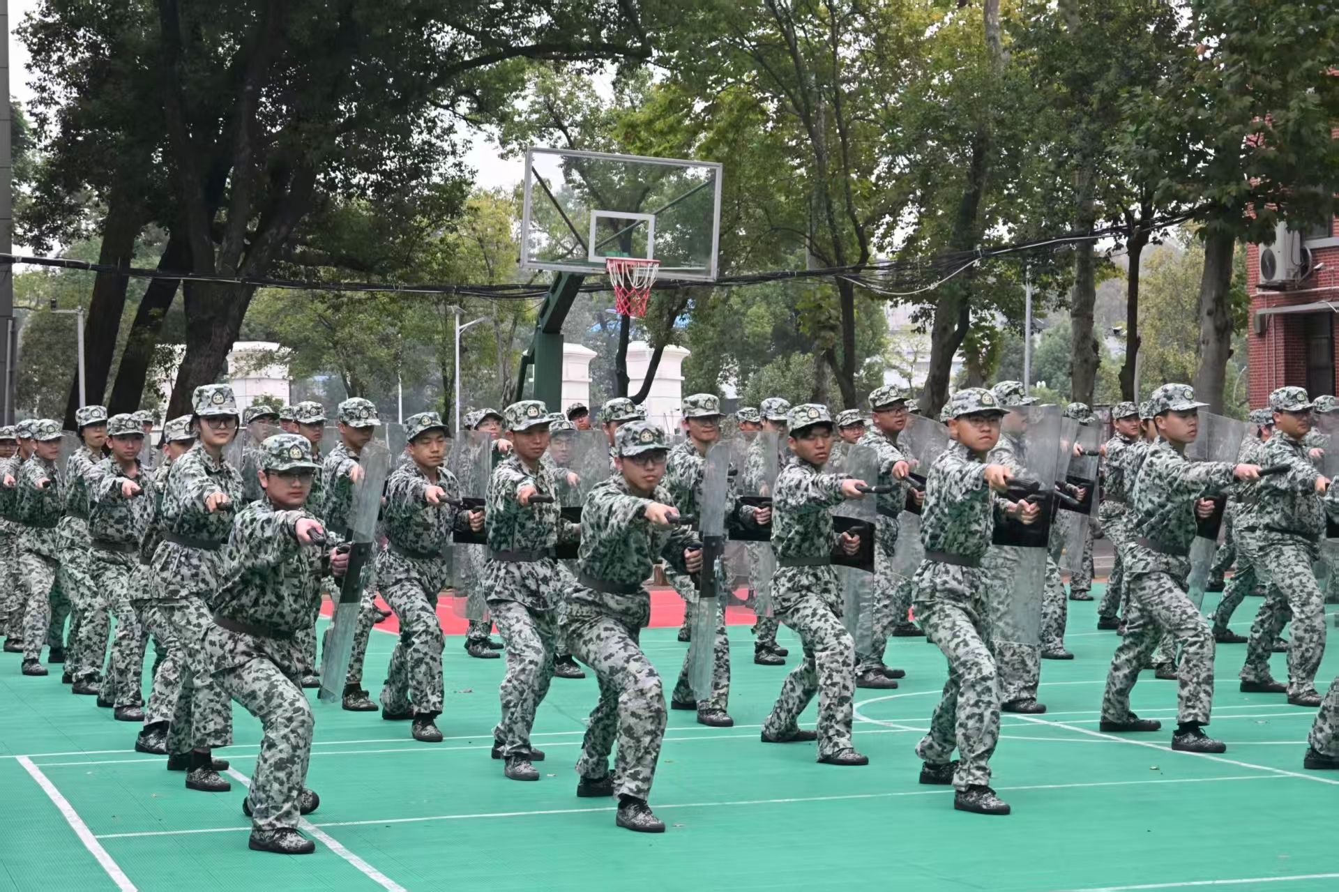 训练场地上,第一方阵进行分列式连贯演练。新生进行正步走、齐步走及原地踏步等队列动作的连贯练习,反复调整动作力度、节奏与排面整齐度。同时,第二方阵对已学的格斗术进行成套复习。为增强表演观赏性与团队默契,学员们在教官的指导下进行集体操练。此外,警棍盾牌方阵开展综合复习。队员们熟练运用此前掌握的警棍盾牌技巧,完成全部战术动作。他们侧重强化队伍整体协调性与动作一致性,以呈现完整的表演效果。训练期间,教官们与2025级辅导员许劲晗全程跟进,针对演练细节进行现场指导与优化。各方阵成员期望通过精益求精的反复合练,达到最佳的集体展示效果。
