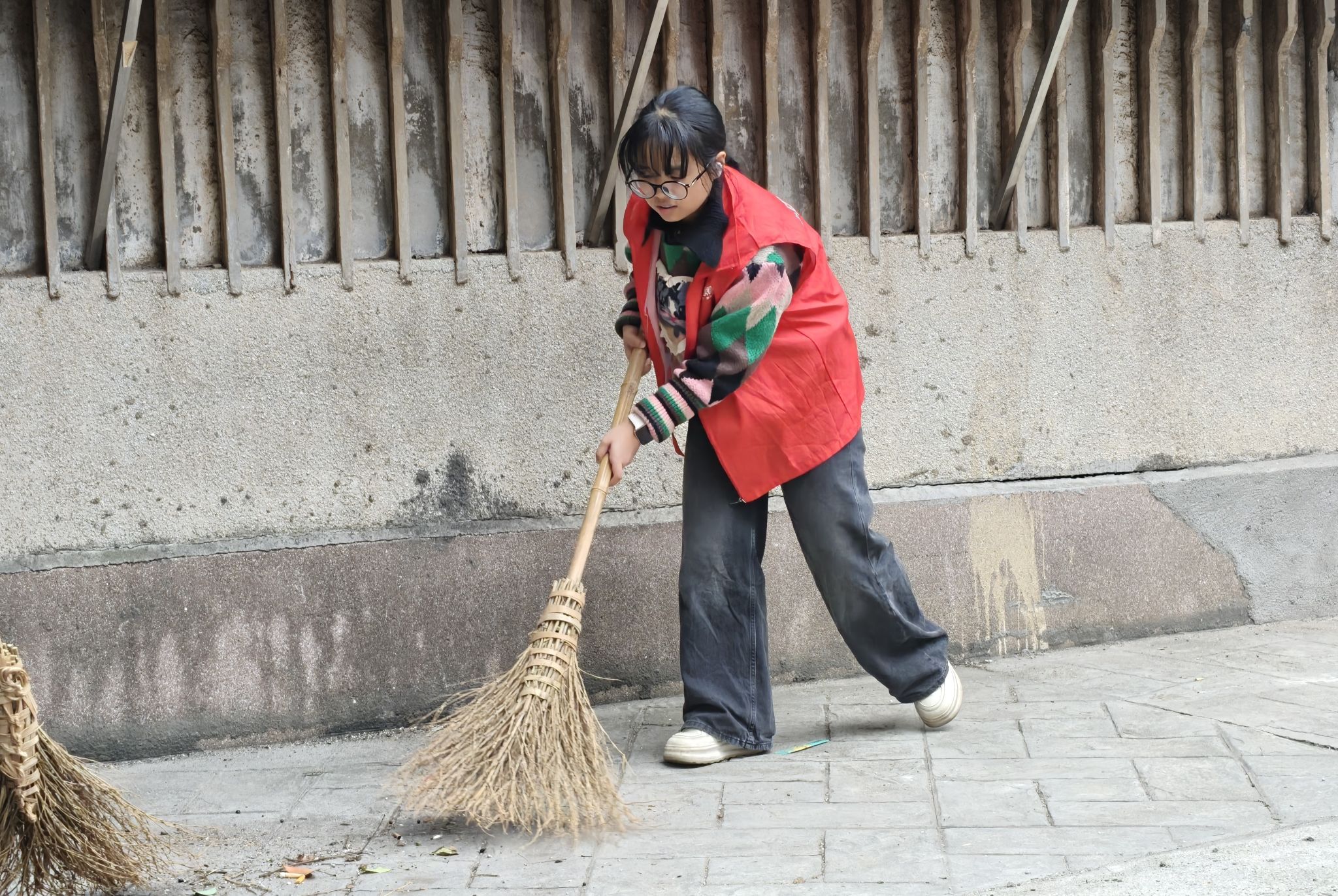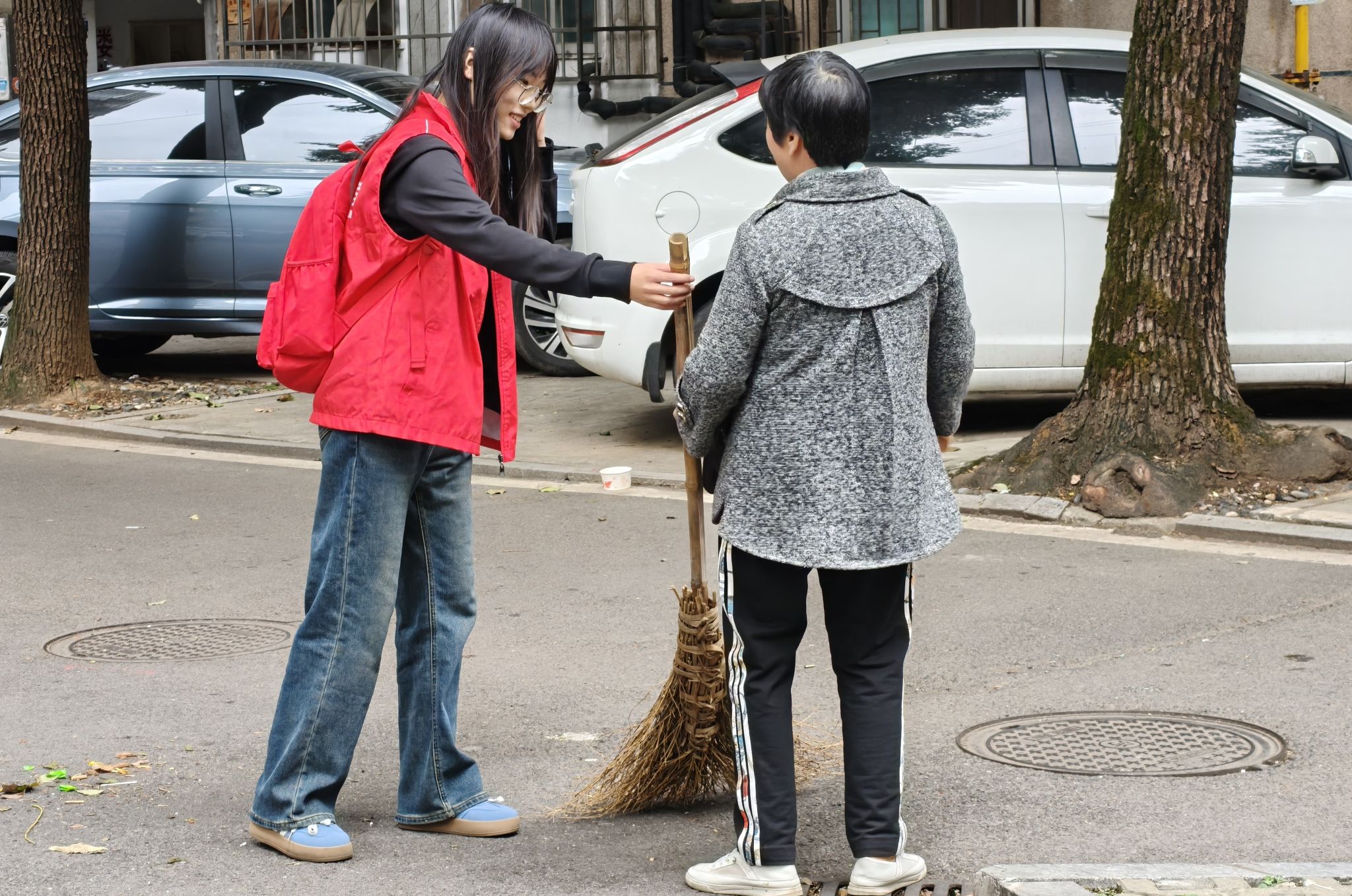 社区人员传授志愿者扫地技巧