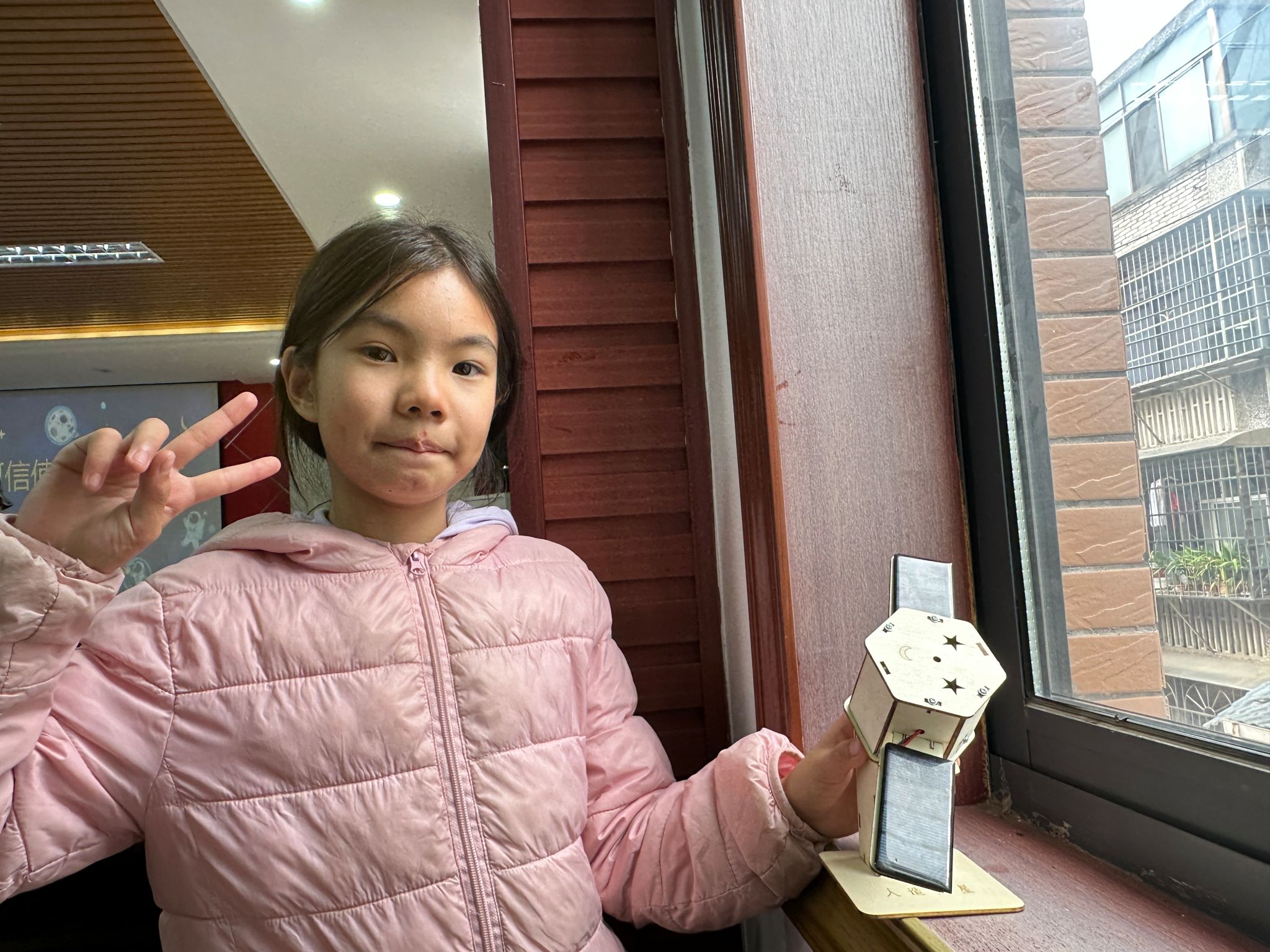 小朋友在窗台边展示和志愿者一起认真完成的手工作品