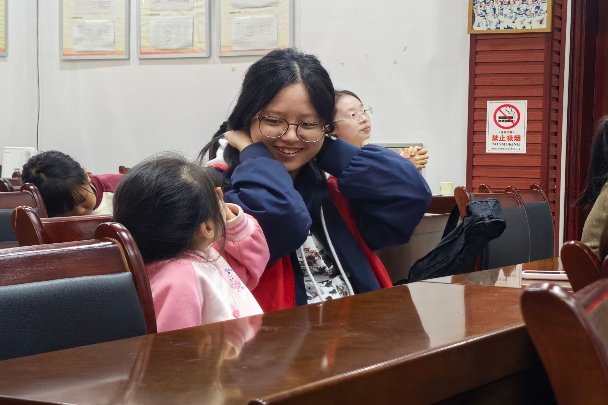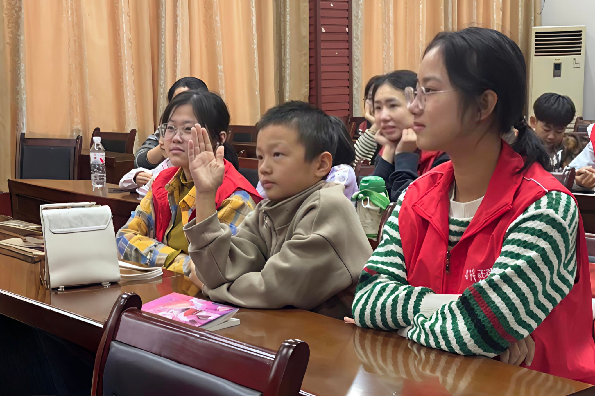 志愿者和小朋友们专心听主讲人进行知识讲解