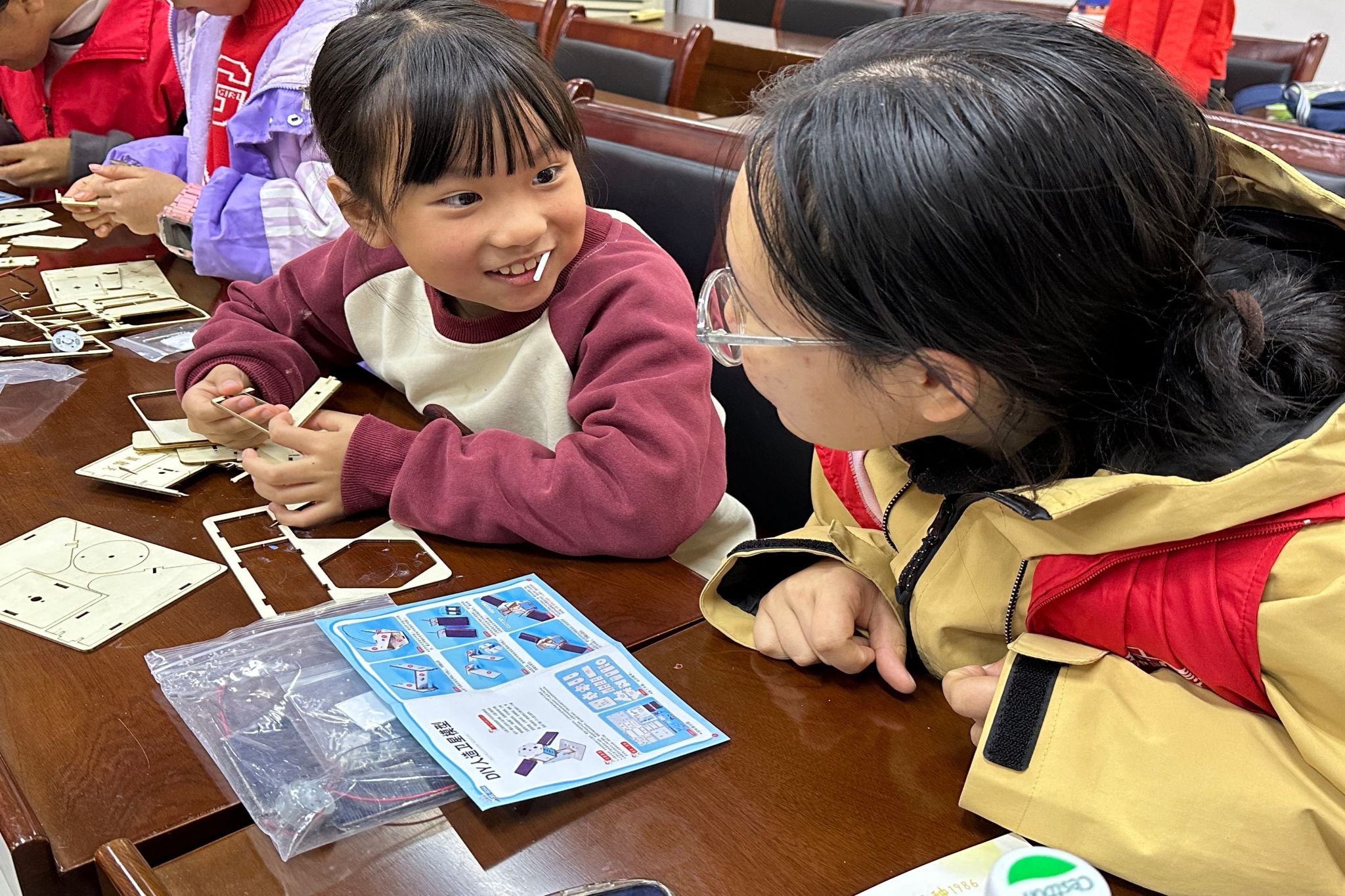 志愿者指导并协助小朋友完成人造卫星小手工