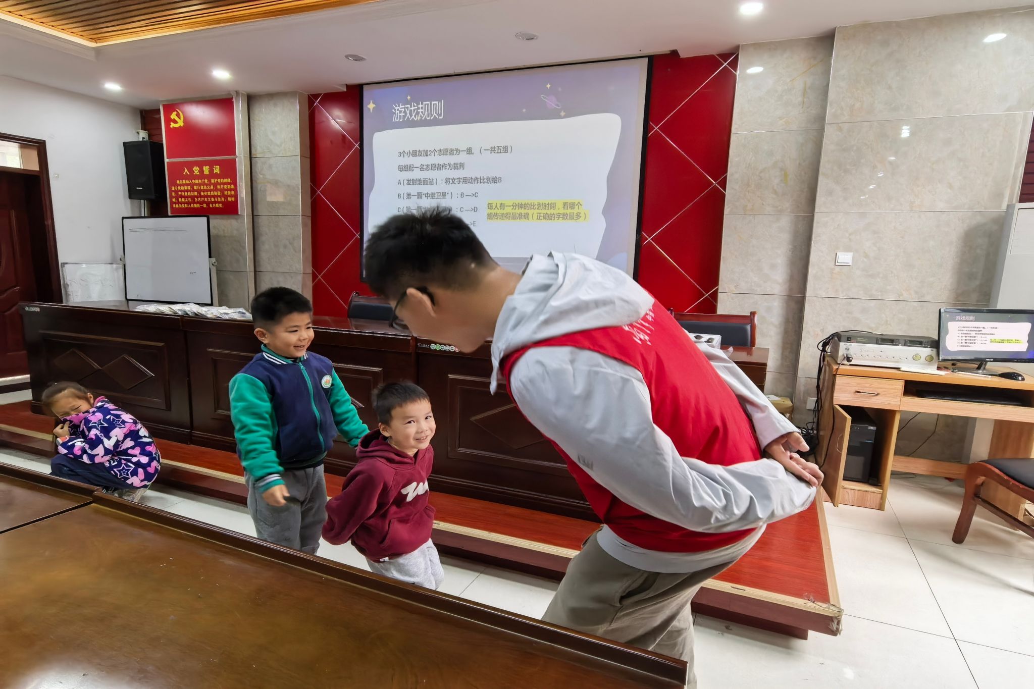 志愿者和小朋友玩你比我猜,模拟卫星间的信息传递