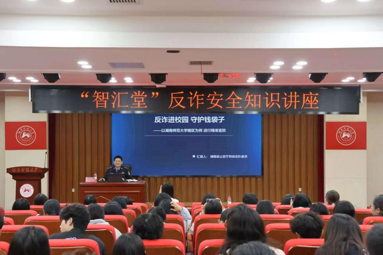 (通讯员 贺紫依 张宇鸣 杨雅甄)10月29日晚,湖南师范大学“智汇堂”反诈安全知识讲座于中和楼129报告厅举办。省公安厅刑警总队反电诈中心崔承警官担任主讲,湘江新区刑侦副大队长唐贝受邀出席。