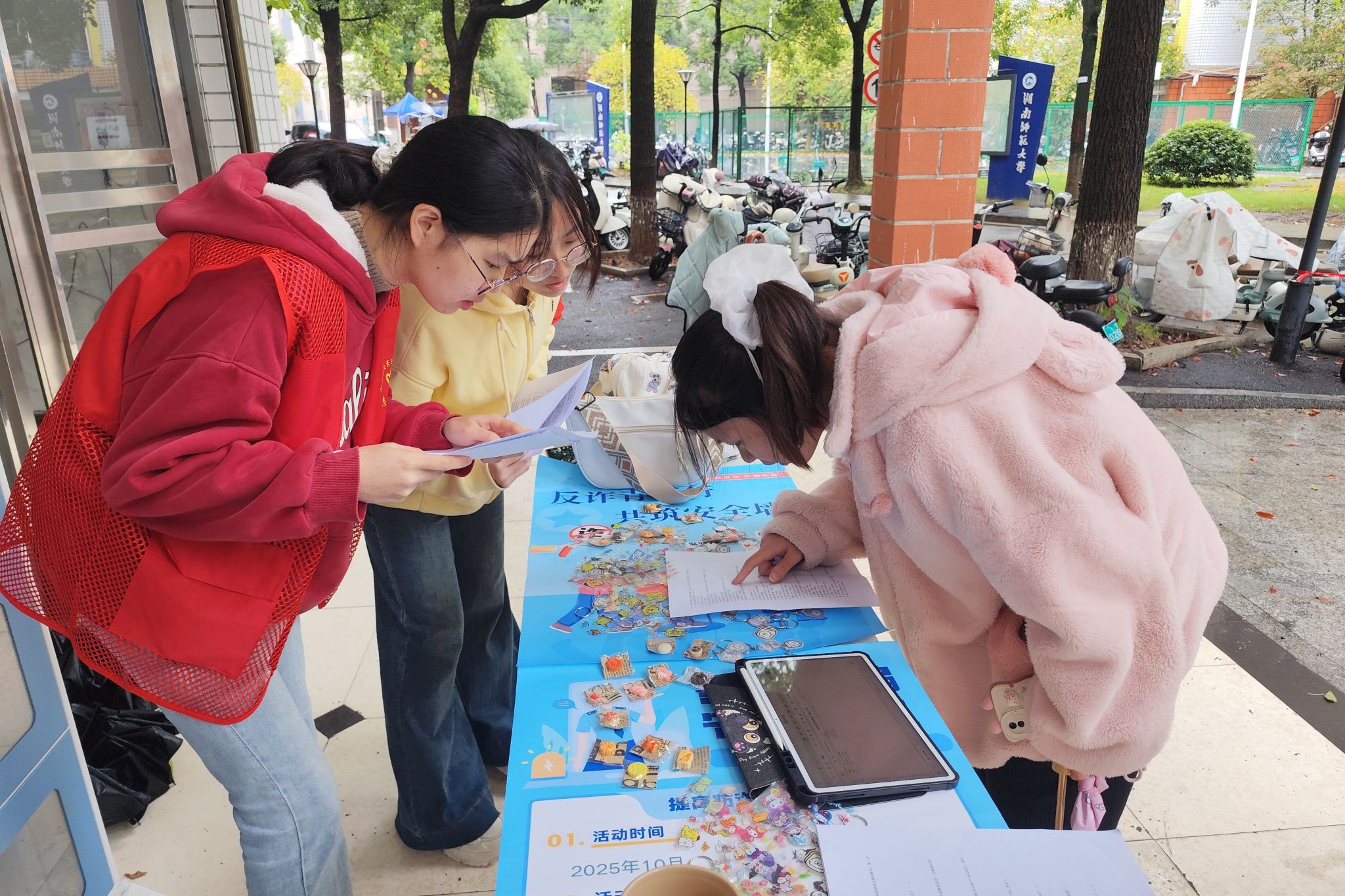 活动现场,参与同学登记个人信息后开始答题。每个活动点配备3名工作人员,1人负责随机抽取题目,1人负责判分,答对1题积2分,积分实时记录。活动特别增设反诈情景模拟抢答环节,主持人接连抛出“冒充老师收取学费”“游戏账号高价收购”等真实诈骗场景,同学们举手抢答。抢答正确的同学获得额外积分奖励,错误作答时,工作人员即时拆解骗局,让大家在互动思辨中加深反诈认知。
