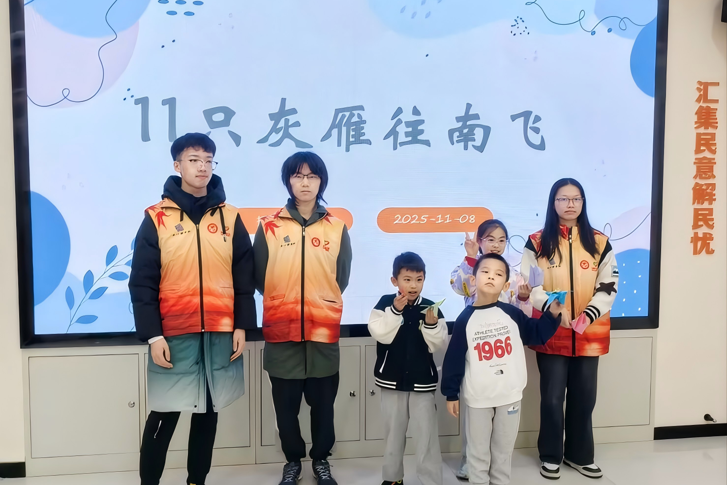 活动开始前,志愿者们提前到场布置好活动场地以便活动有序开展。在小朋友们进行签到并落座后,绘本活动正式开始。主讲人以灰雁的典型特征为切入口,激起小朋友对绘本内容的兴趣。志愿者在讲解绘本过程中,穿插了有趣的热场活动:“蝴蝶飞飞”,这不仅调动了小朋友们参与的积极性,同时也活跃了现场氛围;在折纸环节,小朋友们纷纷选择了自己喜欢的彩纸并折出了自己心目中的大雁。活动结束,志愿者与小朋友们合影留念并打扫了场地。