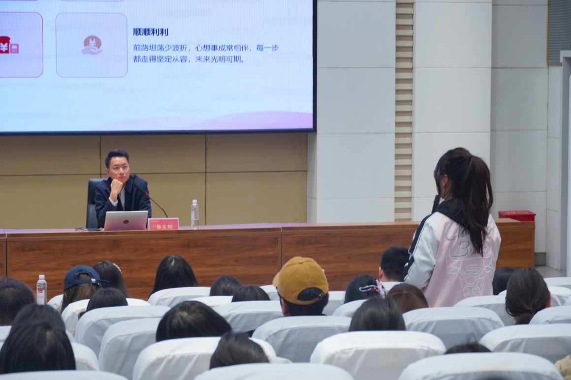 杨东阳围绕“以初心赴使命,以实干致青春”的主题,从政策机遇、学业规划到职业发展,为在场学子带来了一场兼具理论深度与实践指导的精彩分享。他结合自身在岳麓区的工作经历,深刻阐述了新时代青年应具备的五项核心素养。同时,杨东阳从国家级新区的战略定位切入,系统介绍了湖南湘江新区作为中部地区首个国家级新区的发展历程与使命担当。他勉励同学们要主动把握长株潭都市圈建设等国家战略带来的历史机遇,将个人成长融入区域发展大局。在互动环节,同学们围绕政策理解、学业规划、公职准备等话题踊跃提问,杨东阳结合自身经历一一给予细致解答,现场气氛热烈。
