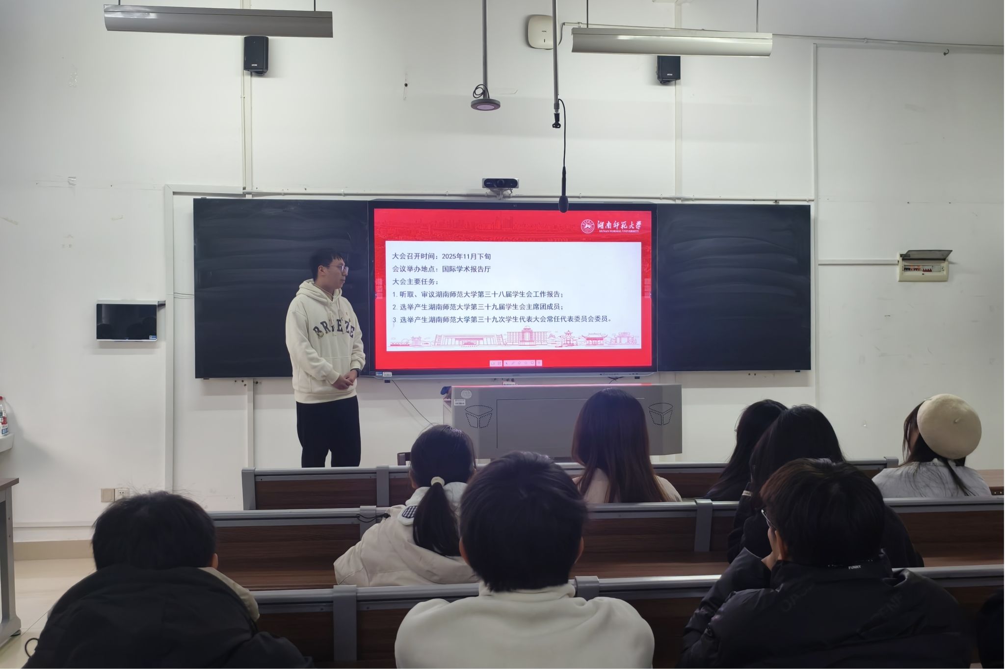 会议开始,主持人详细介绍本次学生代表大会的议程安排、代表名额分配方案及选举程序,并宣读候选人名单。在选举环节,会议采取公开投票、现场唱票的方式,确保选举过程公开透明。各位候选人依次发表竞选演讲,结合自身学生工作经历、服务理念及未来工作设想进行阐述。