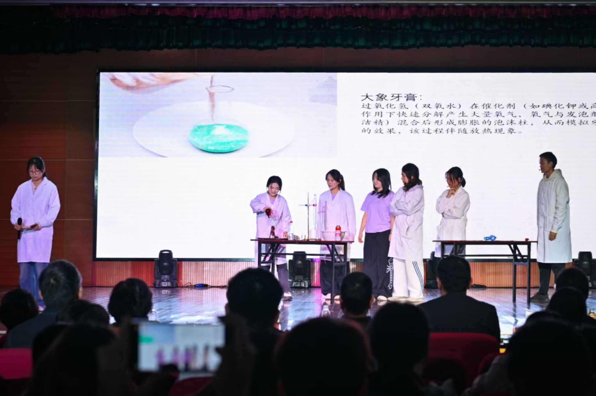 化学与社会协会成员展示趣味化学实验,将专业元素融入表演,体现学院特色。