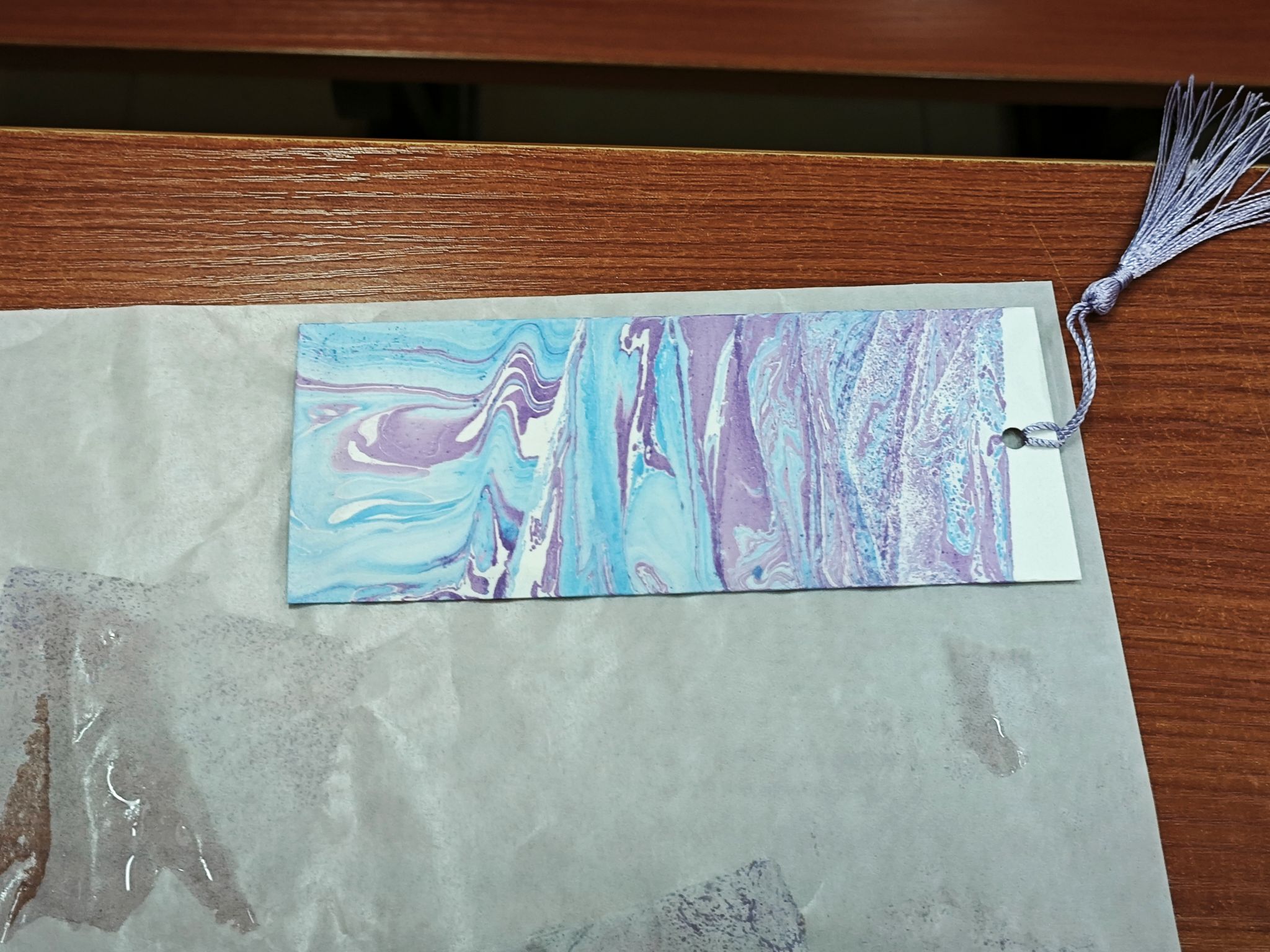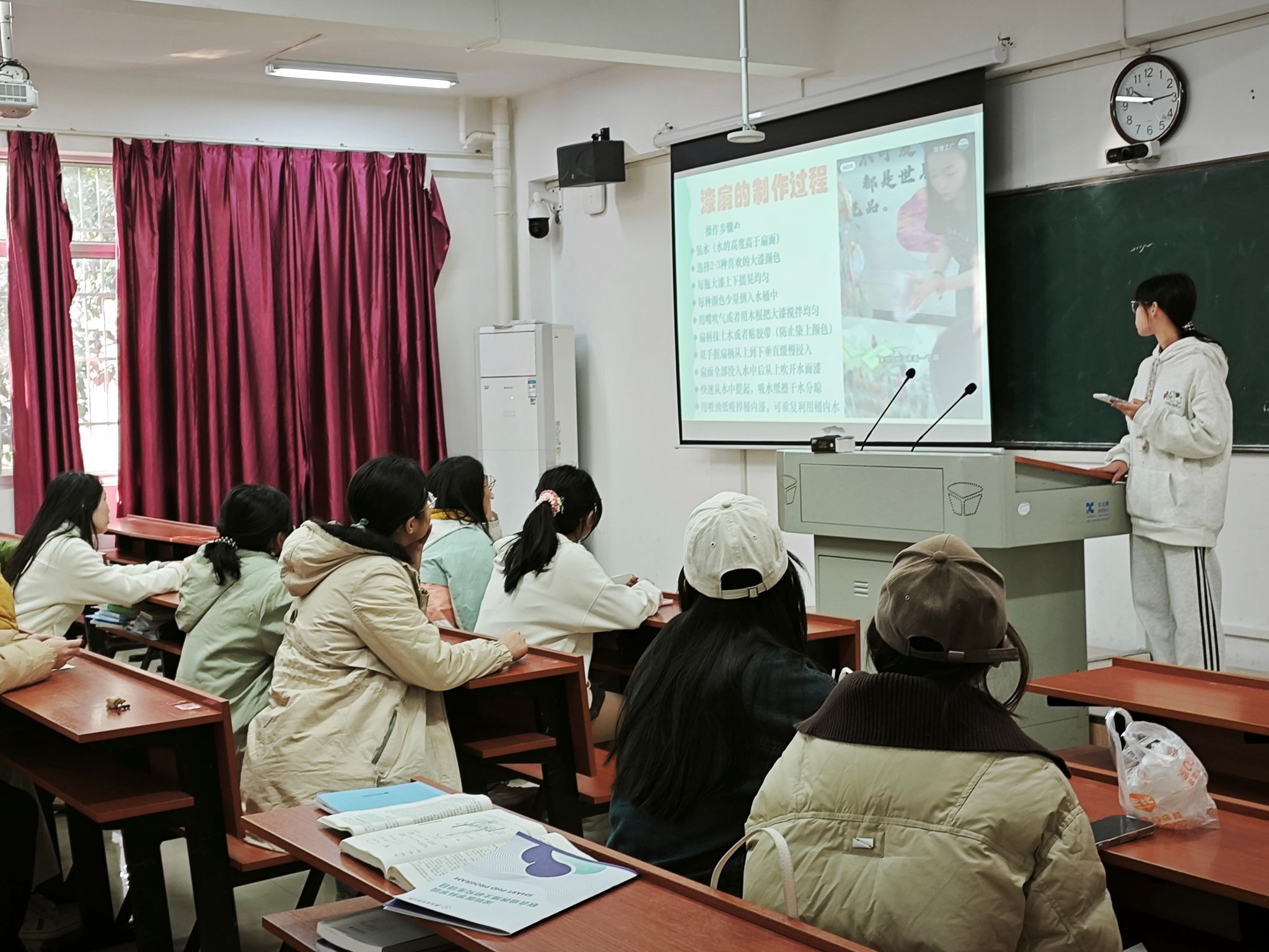 同学们自由参观现场陈列的漆艺样品,感受大漆文化。随后,社团理事从漆艺样品入手,讲解大漆的历史渊源、制作流程及安全注意事项,现场示范上漆、漂染等关键技巧。她表明漆艺作品的完成需要精雕细琢,其中,上漆的精细度对于漆艺作品呈现效果尤为重要。在理事指导下,同学们以红、黑、金等传统色调为主,在扇面与书签上绘制独具个人风格的纹样,运用漂染等工艺完成作品。此外,所有作品均被拍照留念,并得到妥善标记与养护指导。