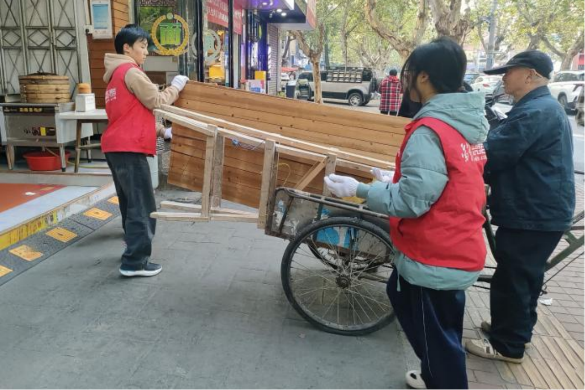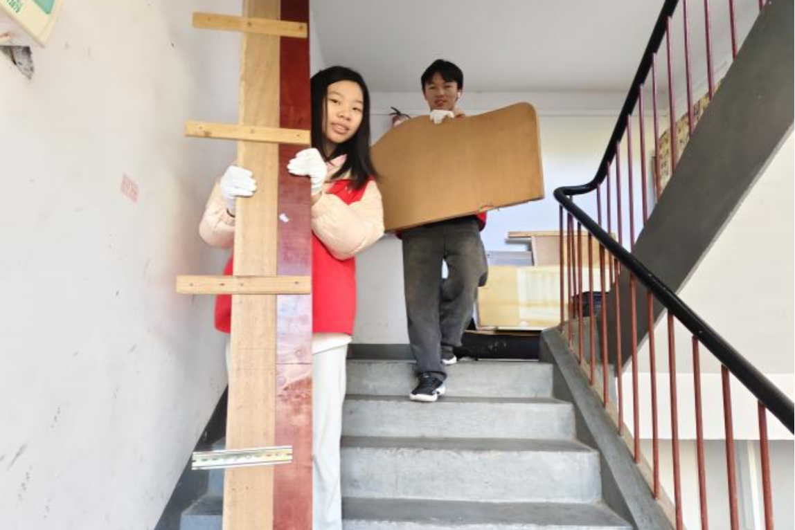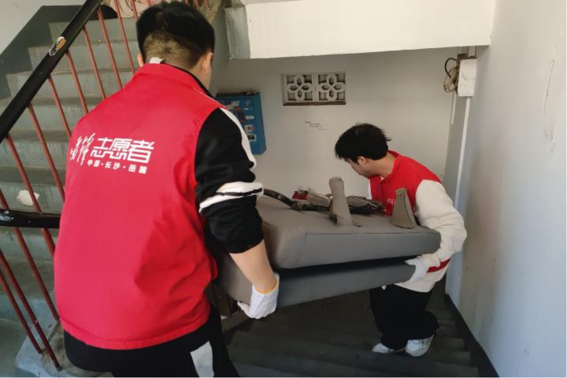 面对大型家具,志愿者采取合作的形式将其搬运
