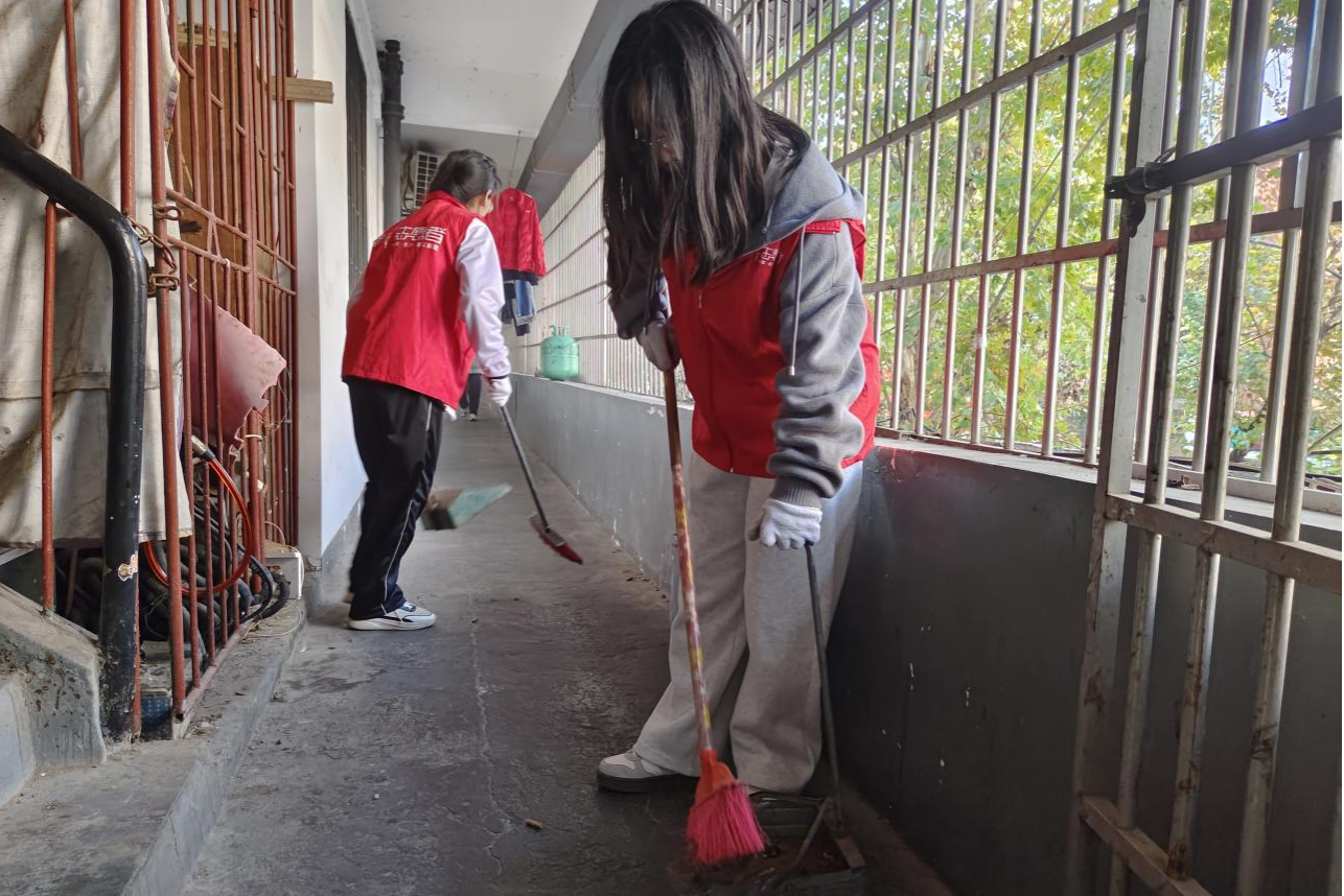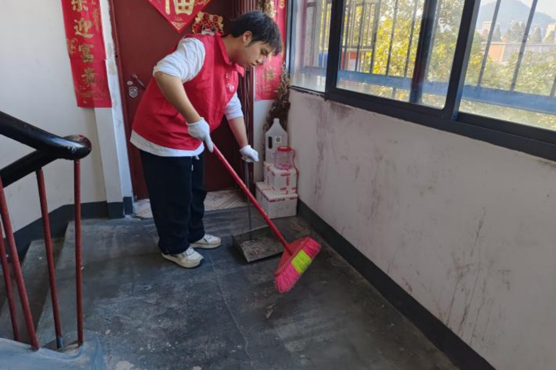 志愿者清理楼道的走廊,不放过任何卫生死角