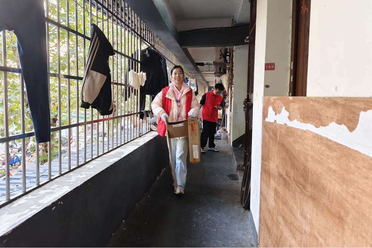 志愿者细心找寻堆积在楼道的纸箱,并将其清理