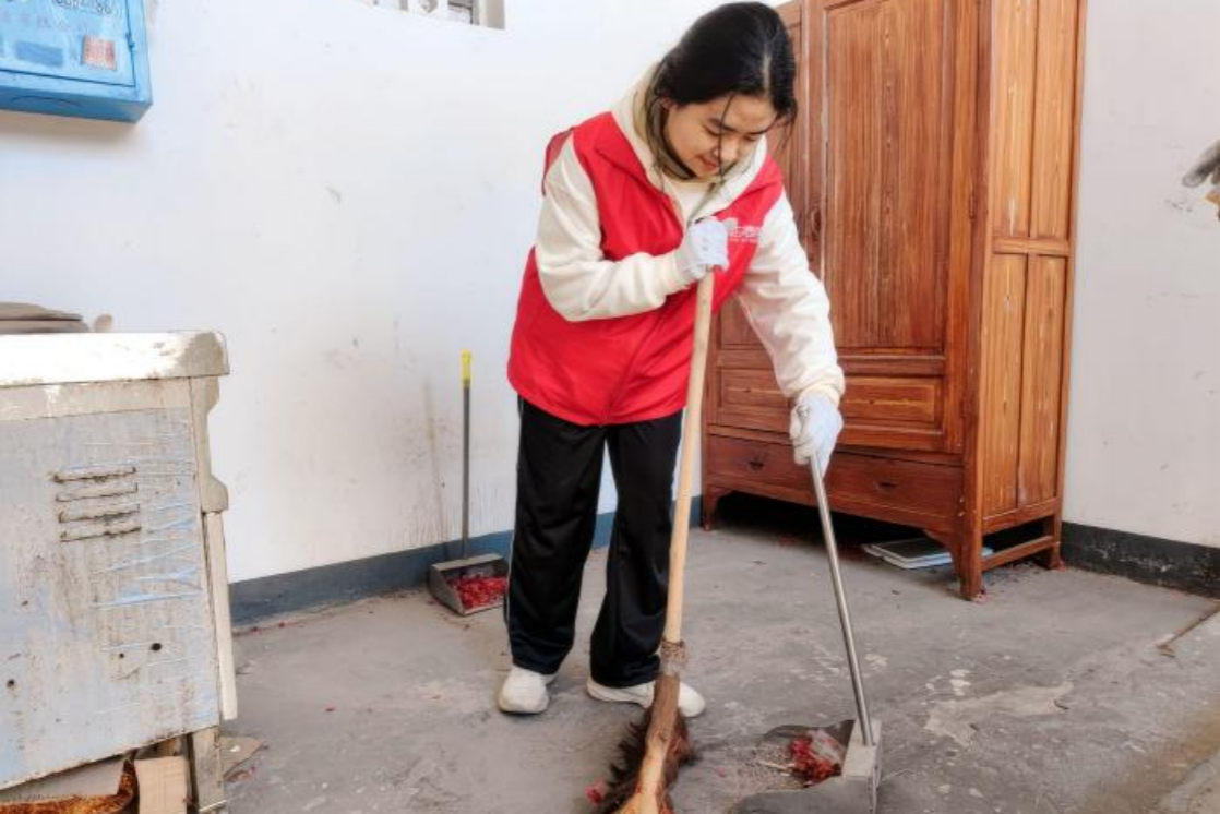 处理完废弃家具后志愿者打扫残留在地上的垃圾