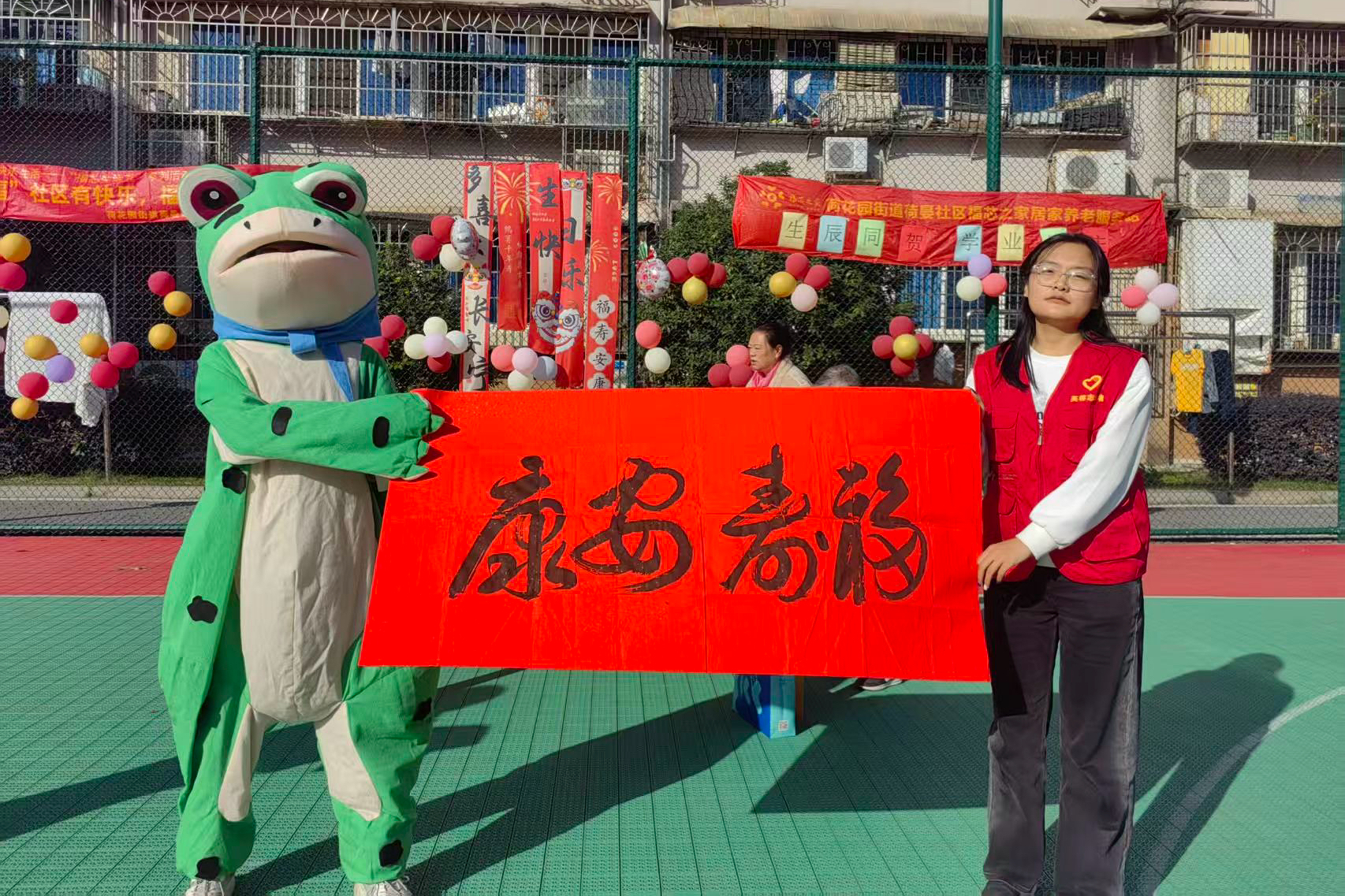 在相关负责人的安排下,志愿者们提前到达现场进行布置整理,在社区篮球场内悬挂红色横幅与彩色气球。身着青蛙造型玩偶服饰的志愿者主动与老人打招呼、陪伴老人并亲密互动,身着红马甲的活动志愿者们协助布置了以“生辰同贺”“福寿安康”为主题的相关装饰,并在活动期间陪同老人们参与投壶游戏。