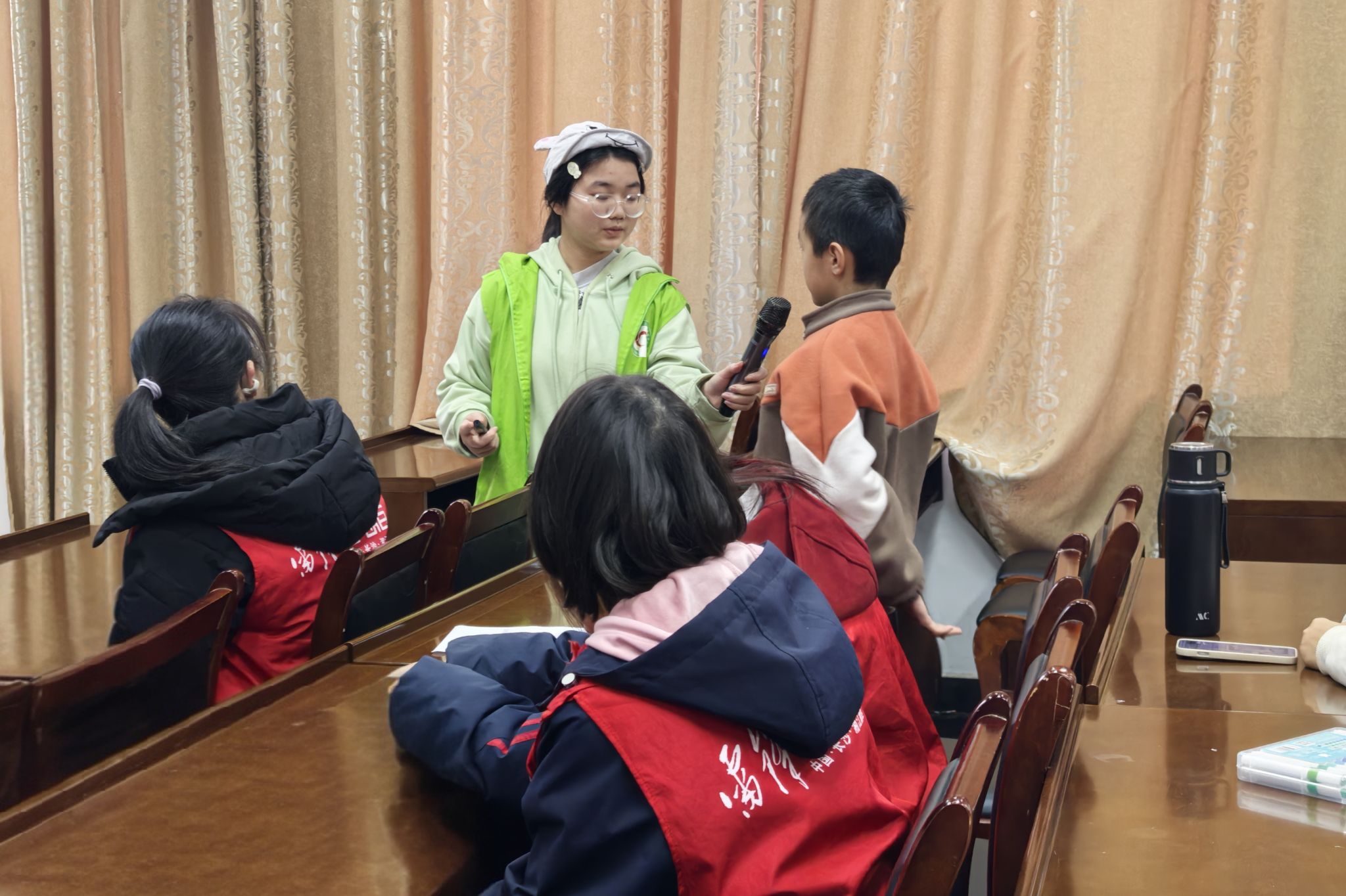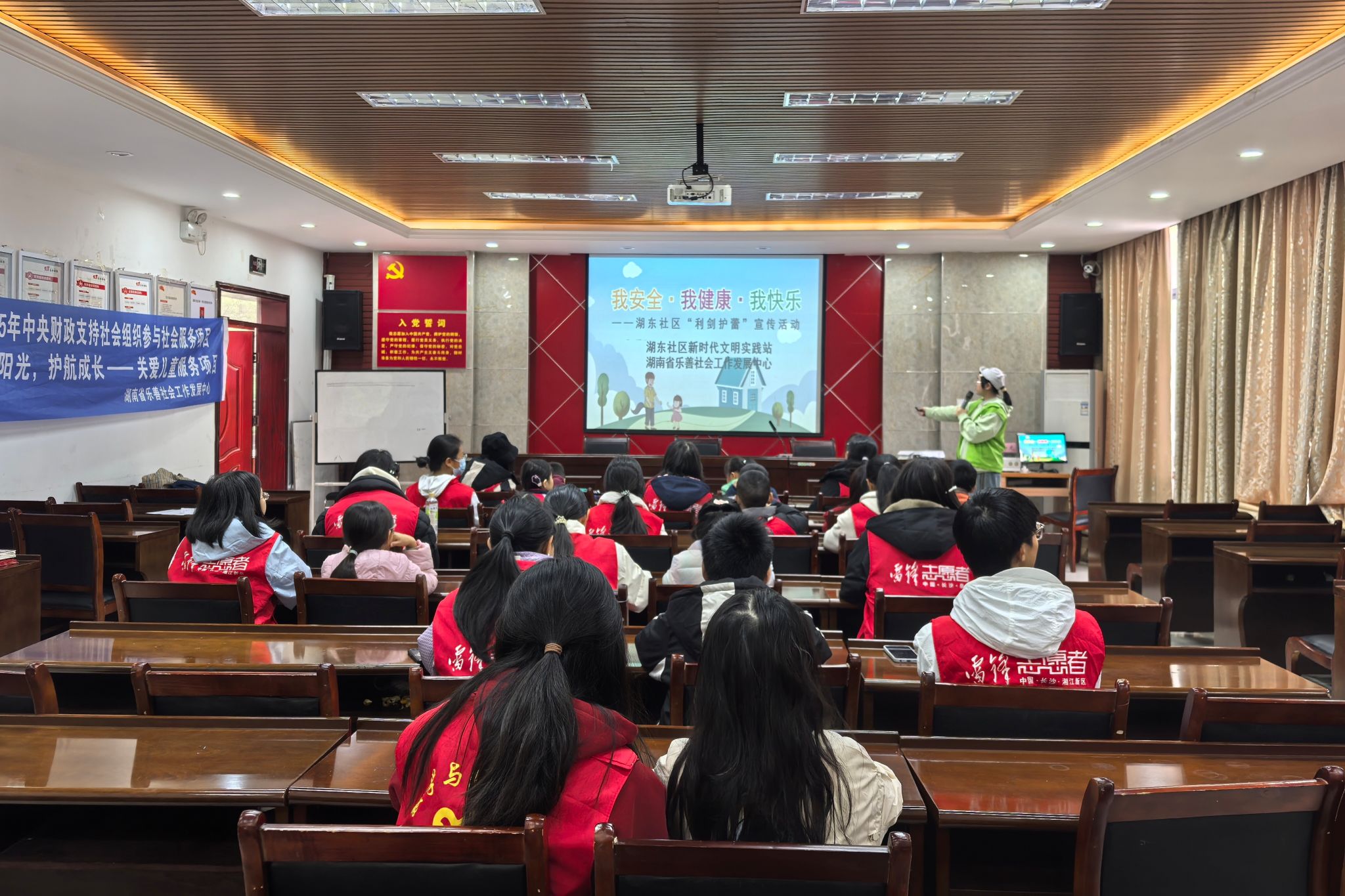 志愿者和小朋友们认真听主讲人进行宣讲