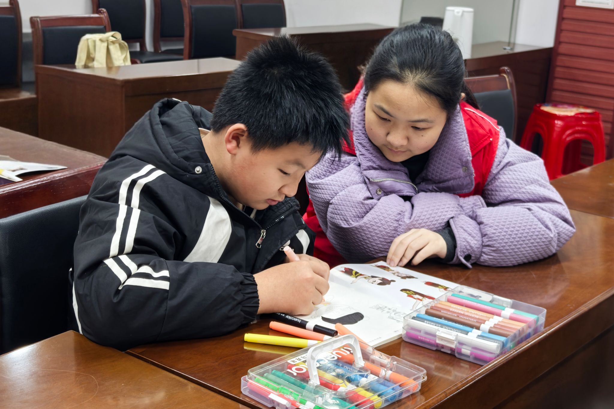 志愿者帮助并指导小朋友进行绘本涂鸦的绘制