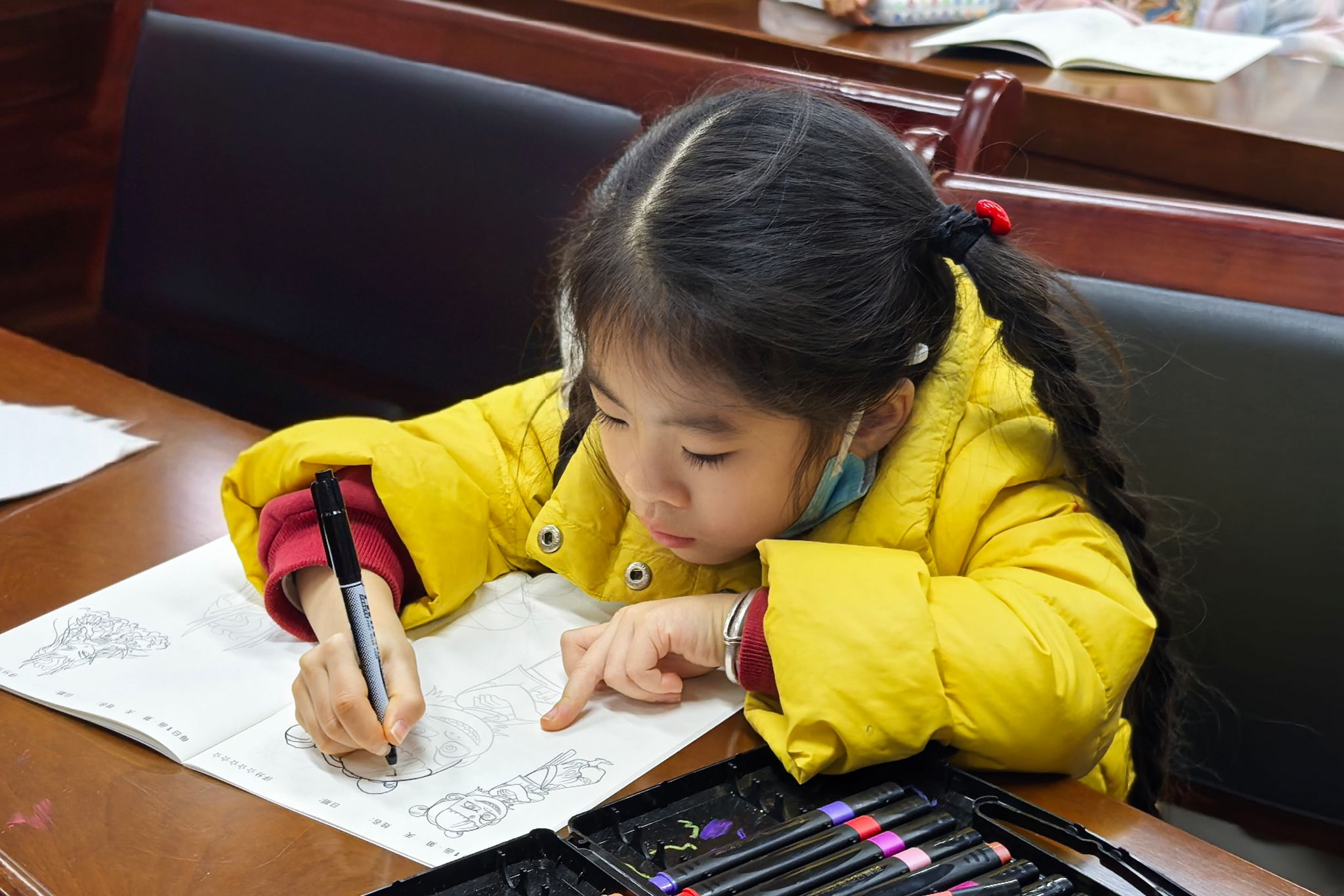 小朋友描摹卡通图案,进行绘本涂鸦