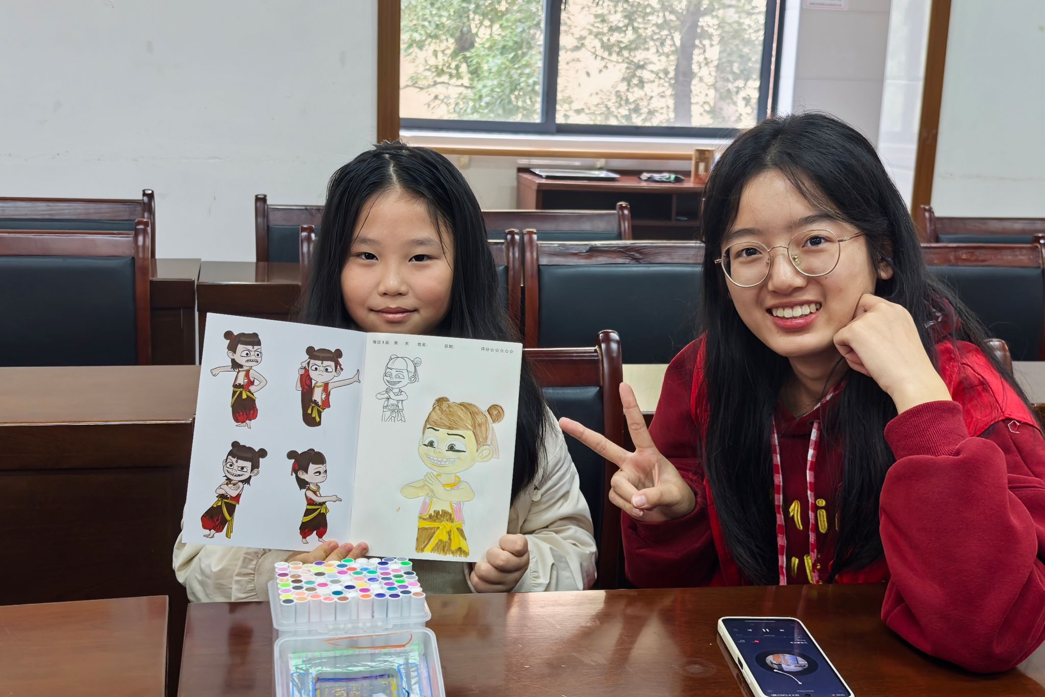 志愿者和小朋友合照,小朋友展示绘本涂鸦作品