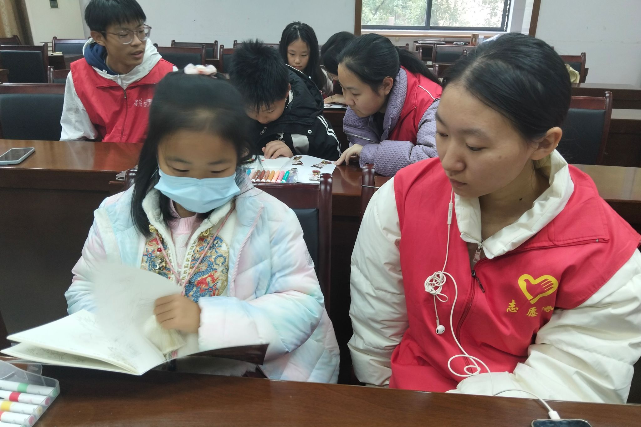 志愿者和小朋友共同翻阅绘本并挑选心仪的卡通图案
