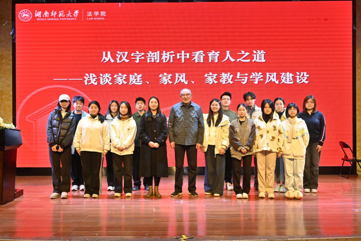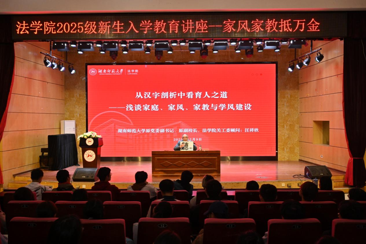 (通讯员 周慕哲 蒋柠宇)12月9日中午,法学院2025级本科新生入学教育讲座之“家风家教抵万金”在树达楼113报告厅举行。湖南师范大学原党委副书记、原副校长、法学院关工委顾问汪祥欣担任主讲人,2025级辅导员许华燕主持讲座。