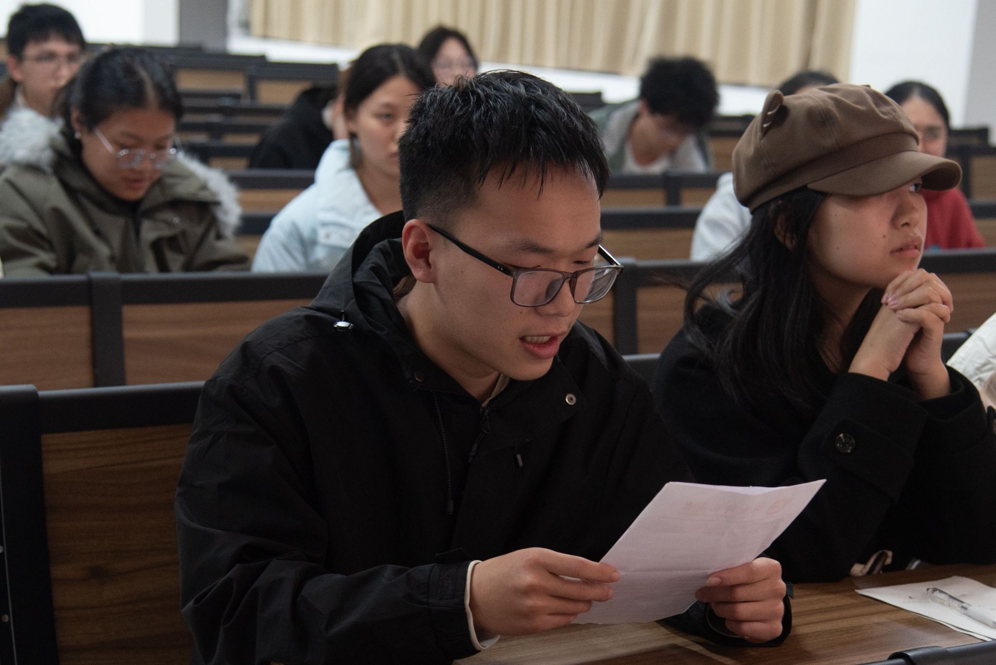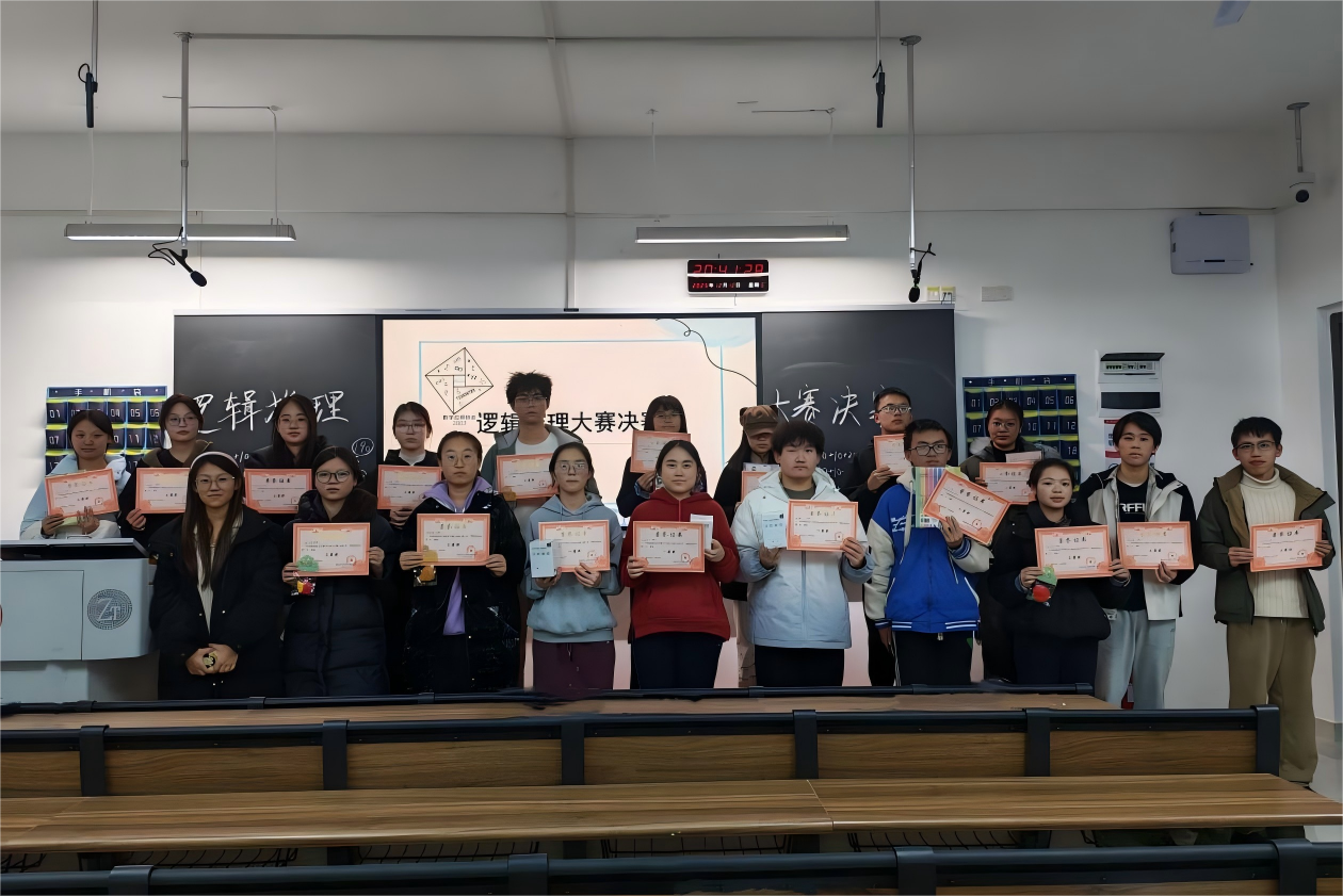 比赛分为初赛与决赛两个阶段。在初赛阶段,参赛学生于规定时间内完成了逻辑推理试题,比赛负责人依据答题正确率遴选出优秀选手晋级决赛。在决赛过程中,参赛学生自由组队,比赛负责人通过幻灯片同步展示题目,各个队伍依次完成了轮流选题作答、抢答、团队共同作答三个环节。比赛负责人统计了各队伍总分后,现场公布最终结果,并为所有获奖学生颁发奖状与奖品。颁奖环节结束后,获奖学生们在教室前方指定区域合影留念。参赛学生表示,参加这次逻辑推理大赛不仅锻炼了自身的逻辑思维能力,还让他和队友建立了深厚的友谊。