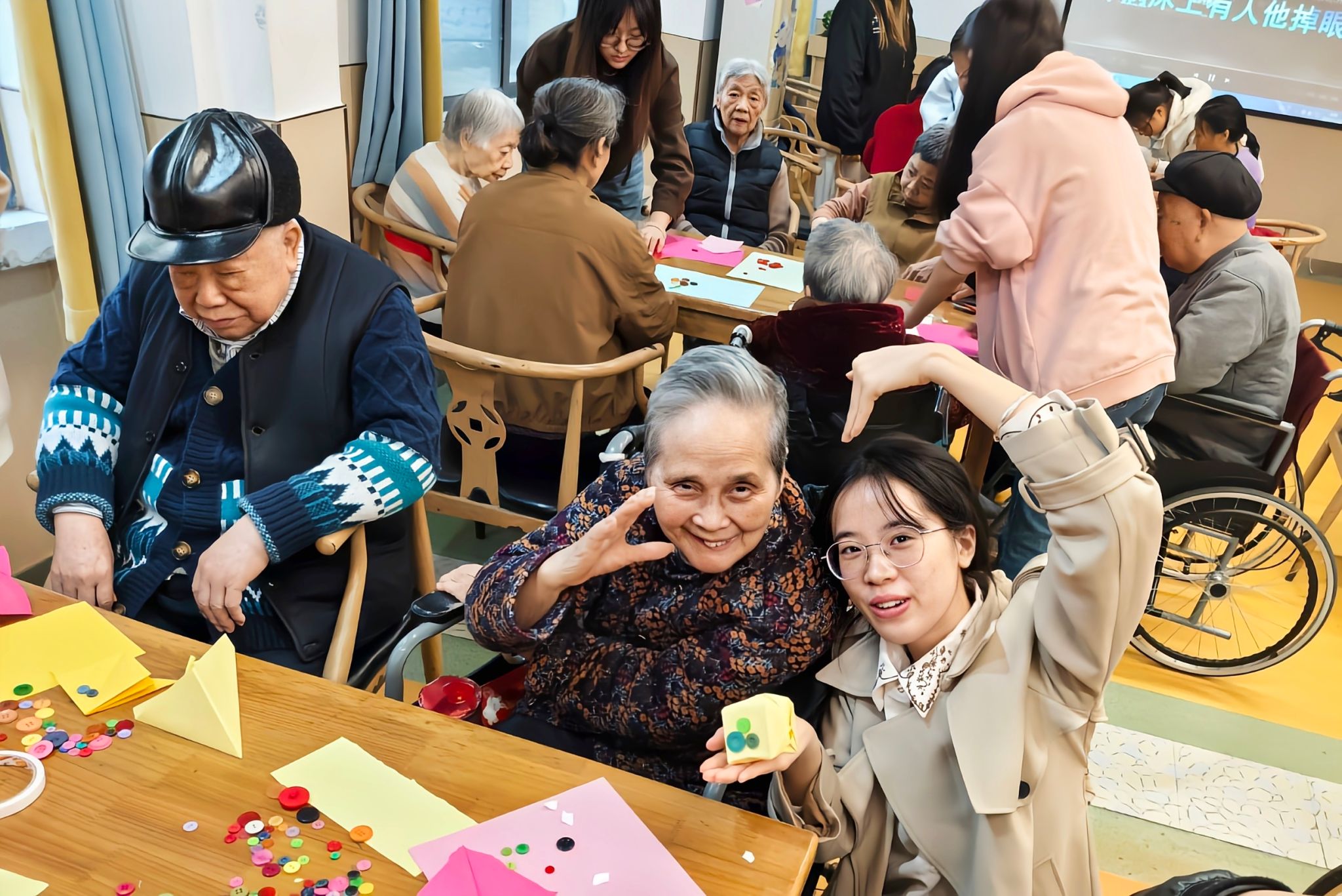 志愿者与老人一起做手工