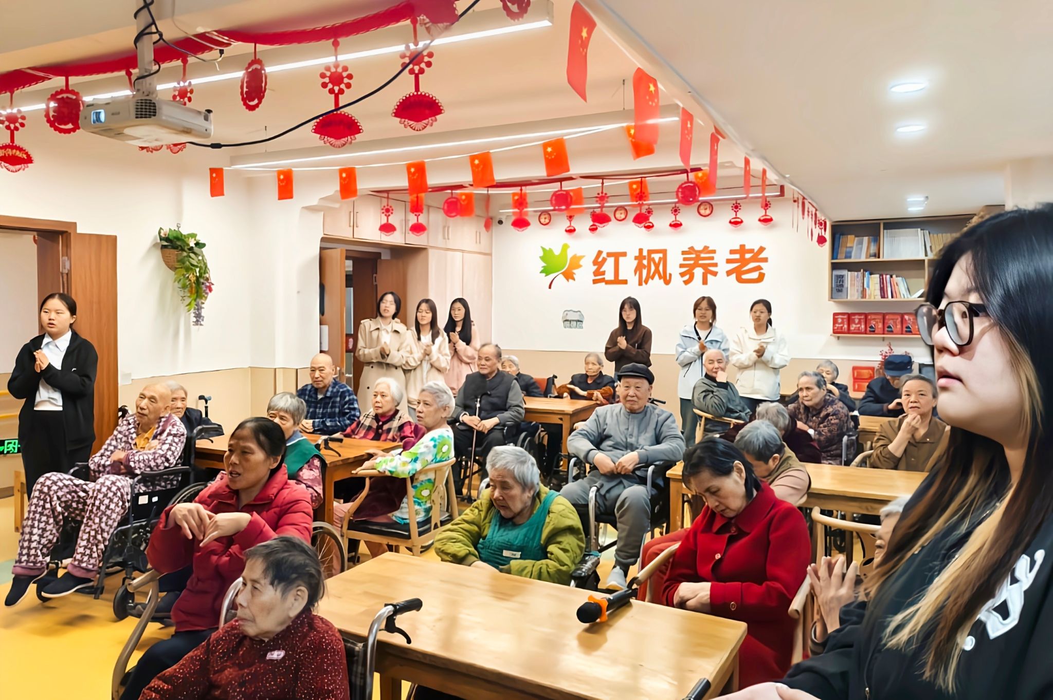 志愿者与老人一起合唱
