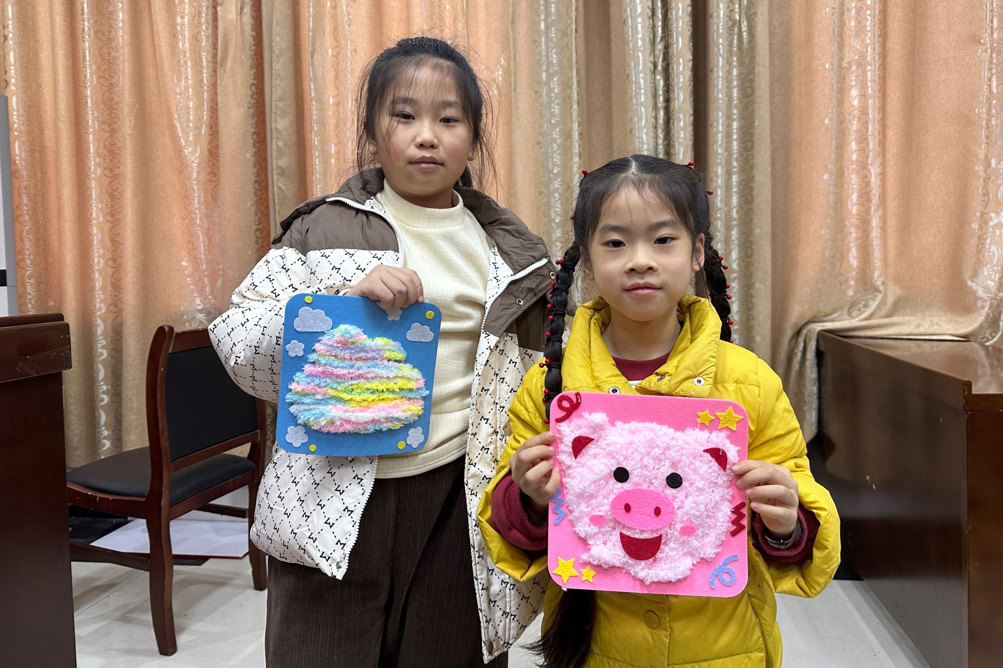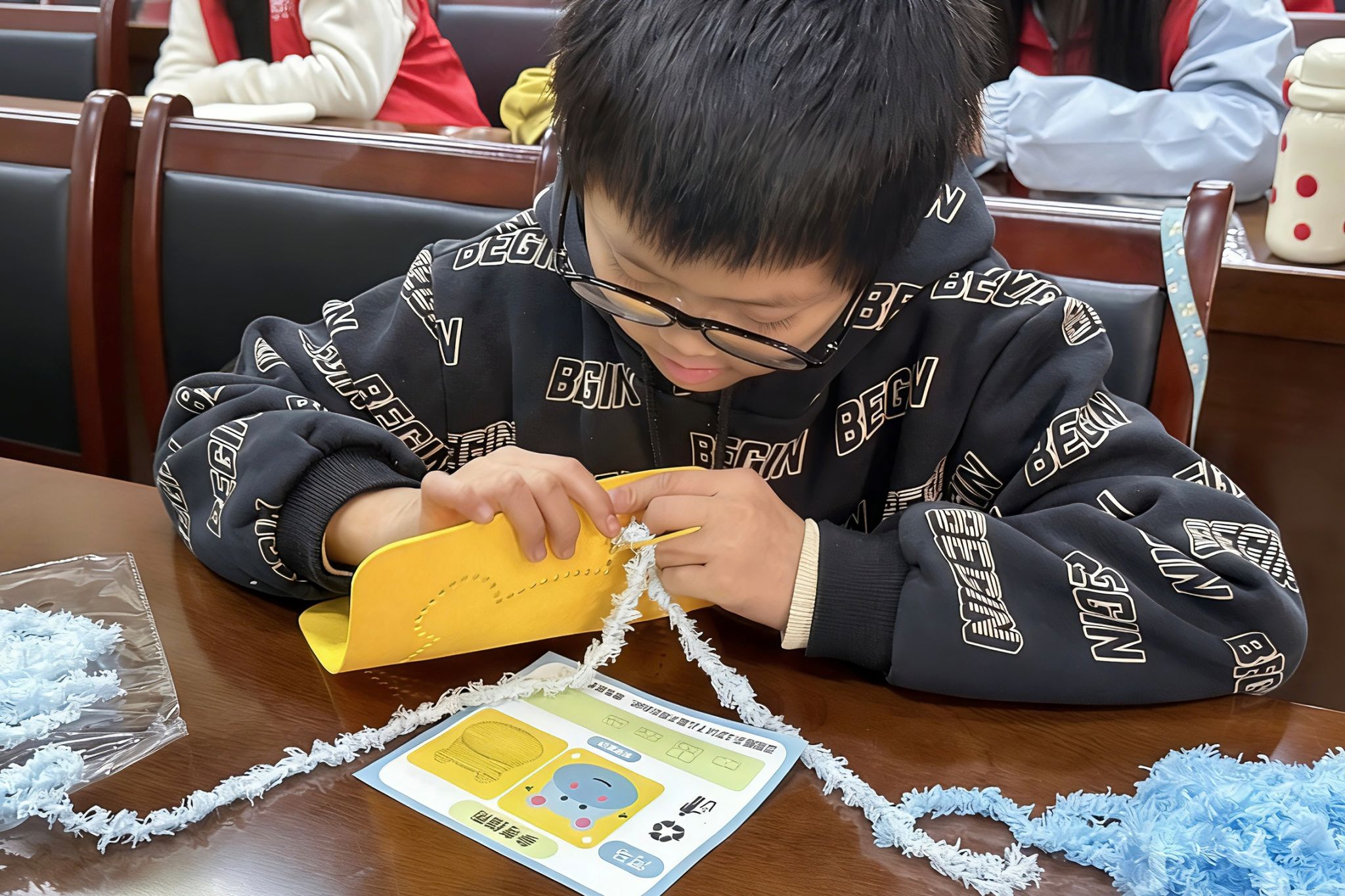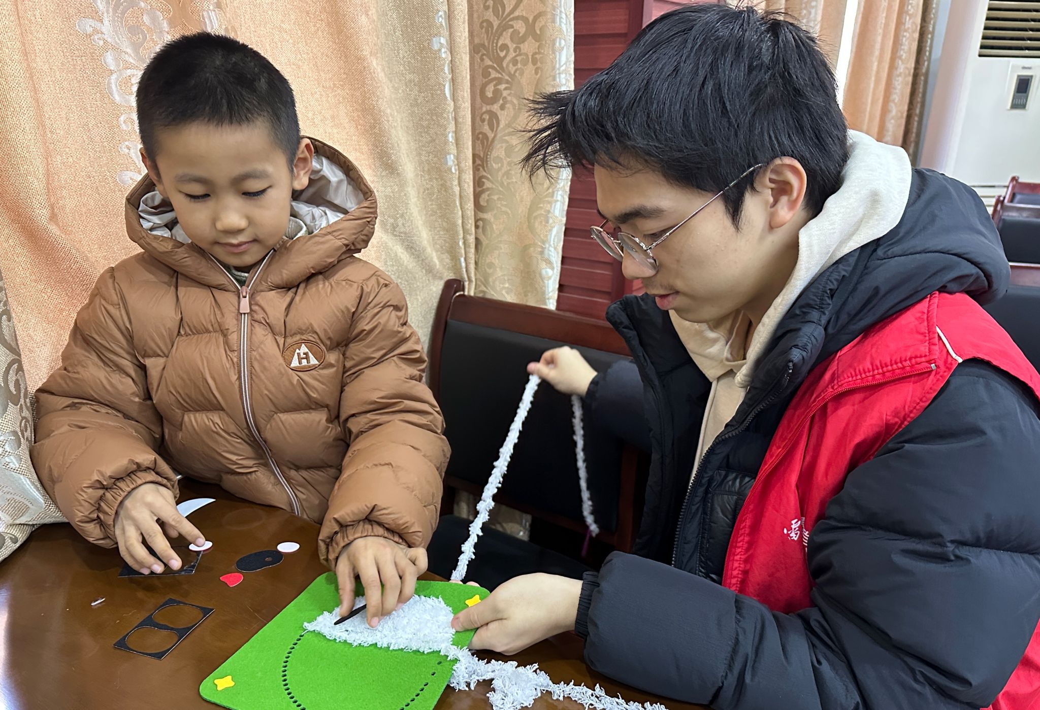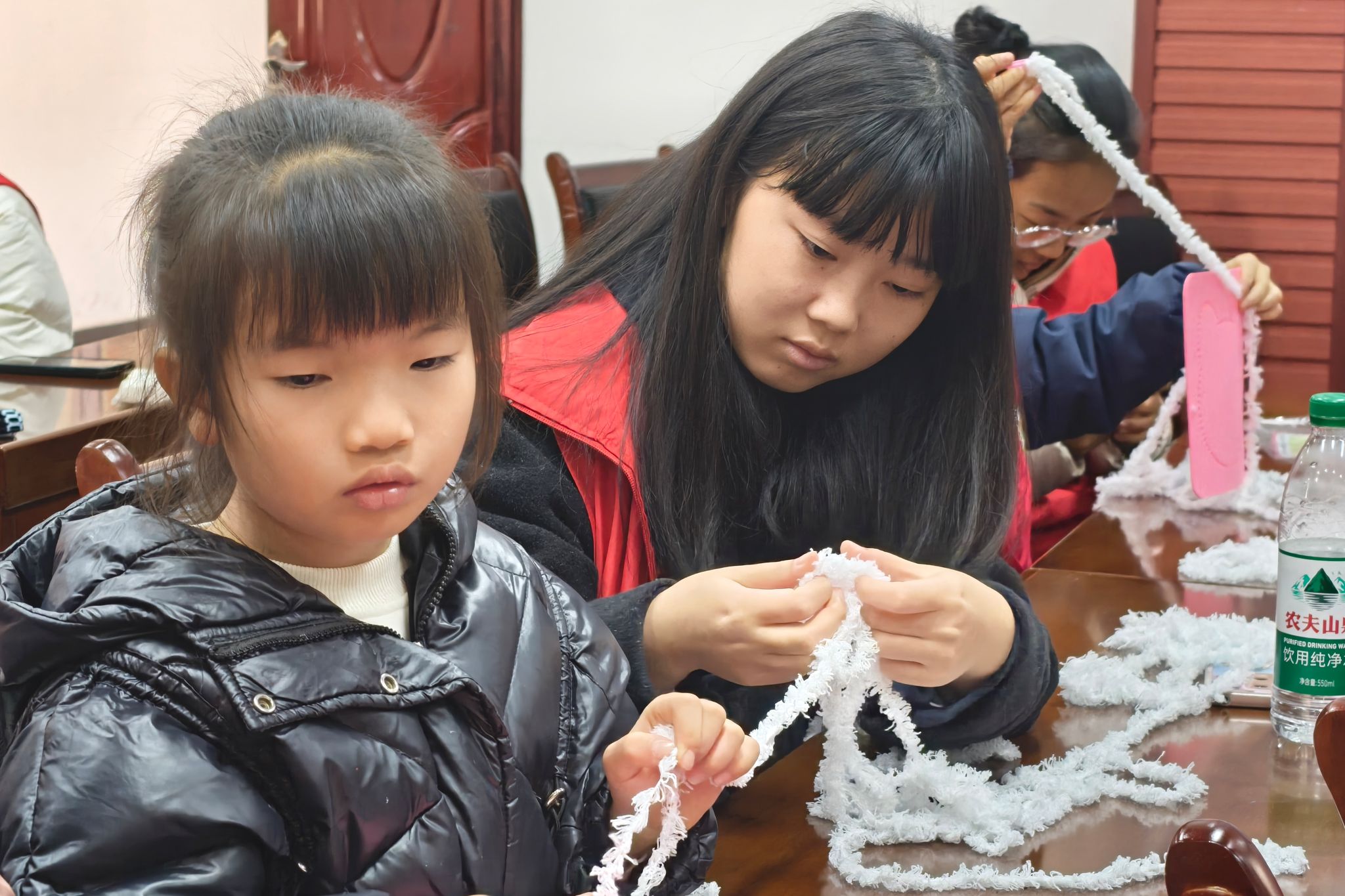 志愿者帮助小朋友理清绳线,做好绣品制作的准备工作