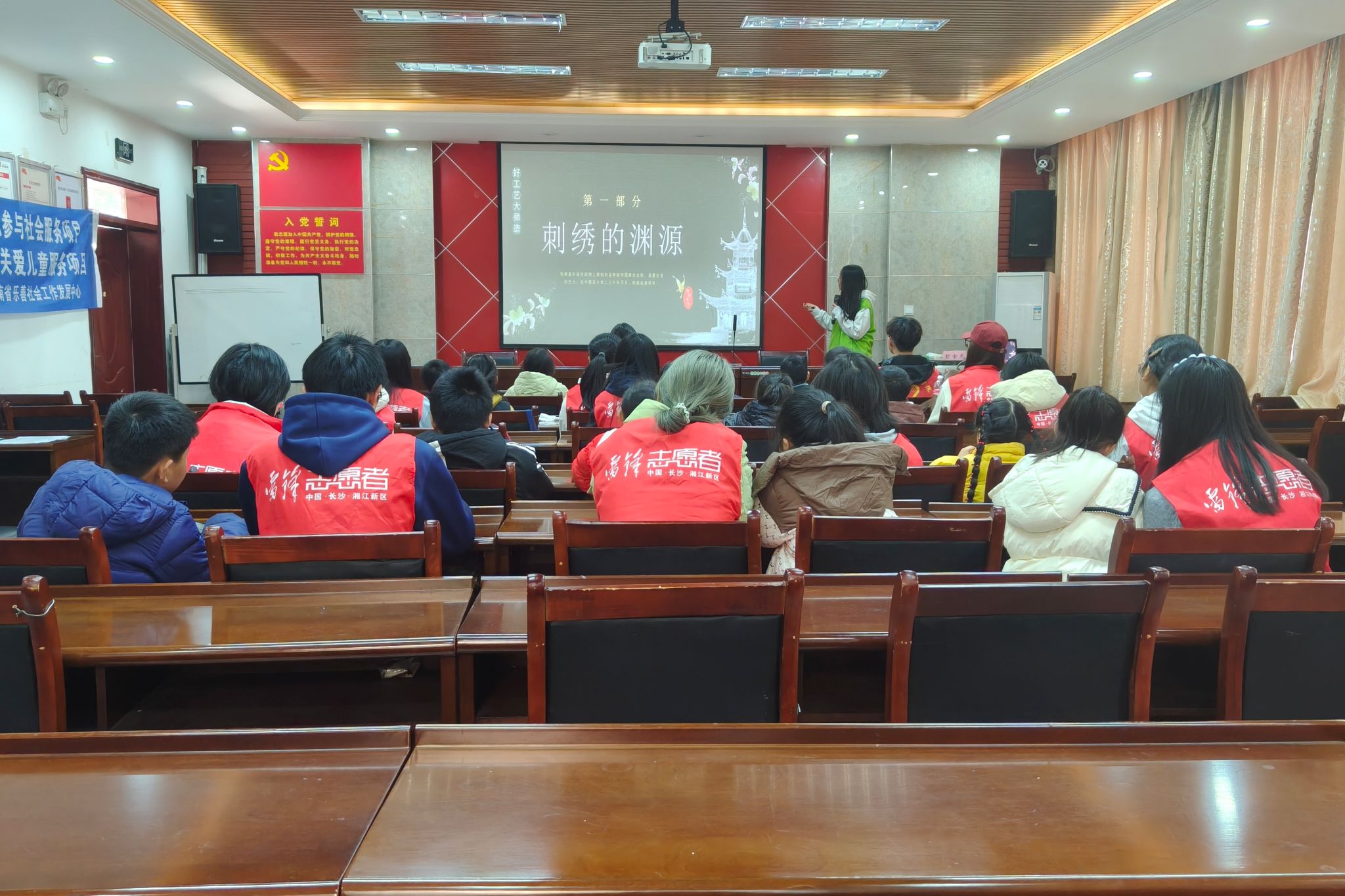 志愿者和小朋友们专注地聆听宣讲并学习刺绣相关知识