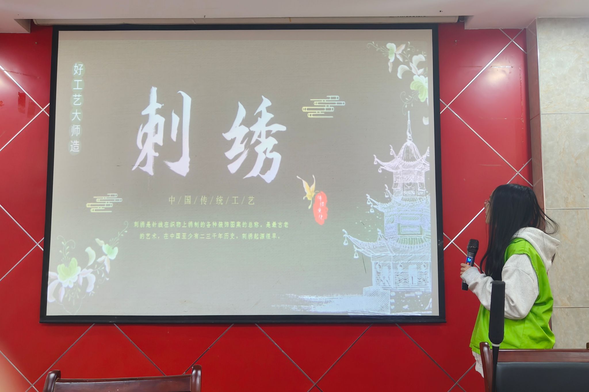 主讲人进行刺绣主题宣讲,详细地介绍相关知识