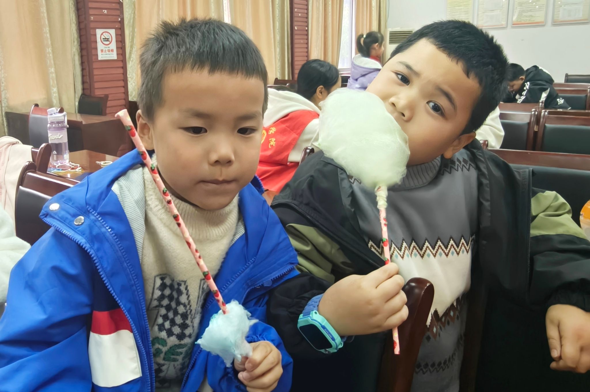 志愿者和小朋友对他们制作的棉花糖进行展示