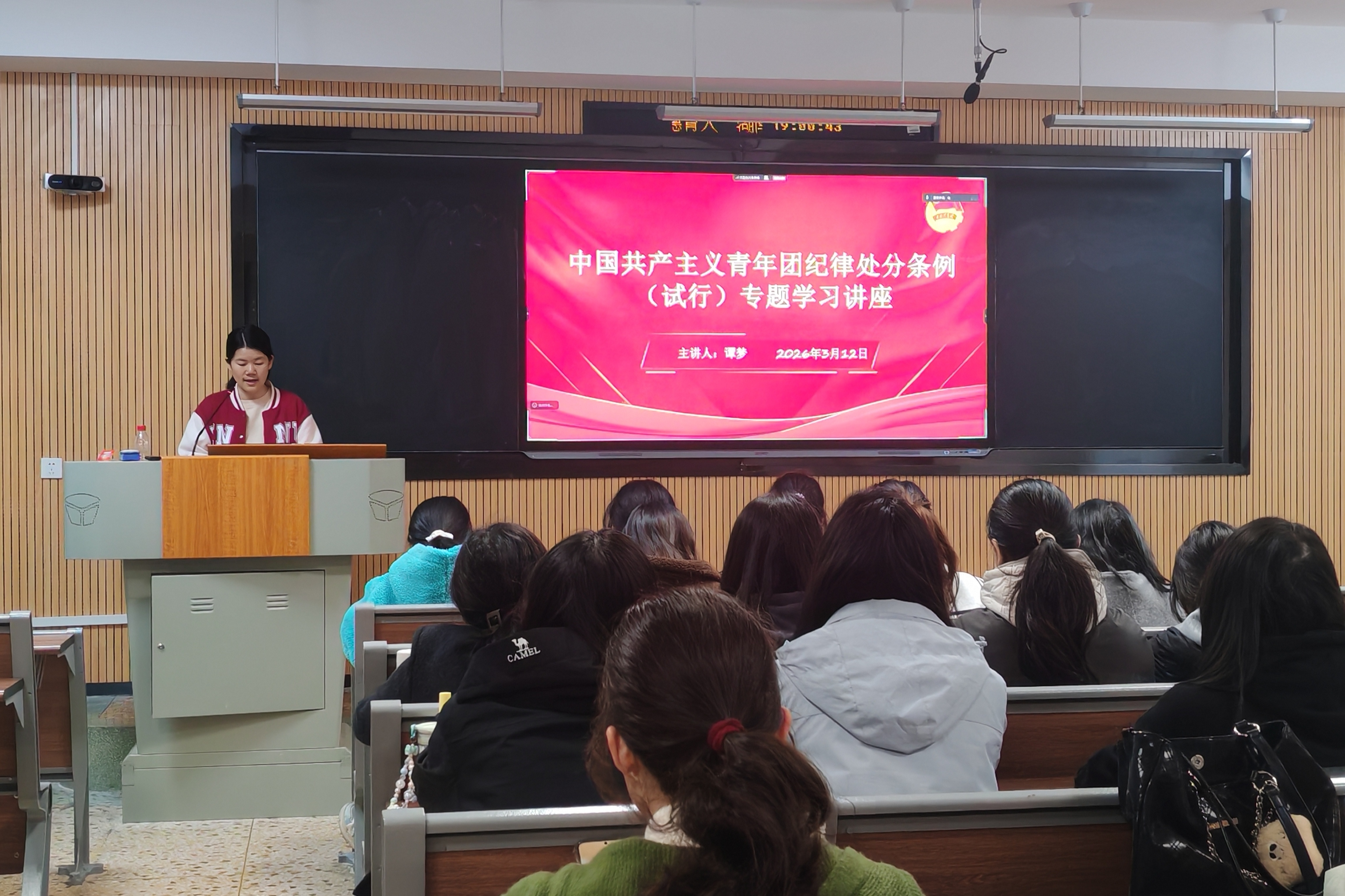 (通讯员 付莹 梁祺)为引导广大团员青年深入学习《中国共产主义青年团纪律处分条例(试行)》(以下简称《条例》),增强纪律观念,明确行为底线,3月12日晚,教育科学学院(以下简称“教科院”)在院211教室及张公岭校区211教室同步开展励行团校专题学习讲座。院团委书记谭梦担任主讲人,教科院171名学生参加学习。