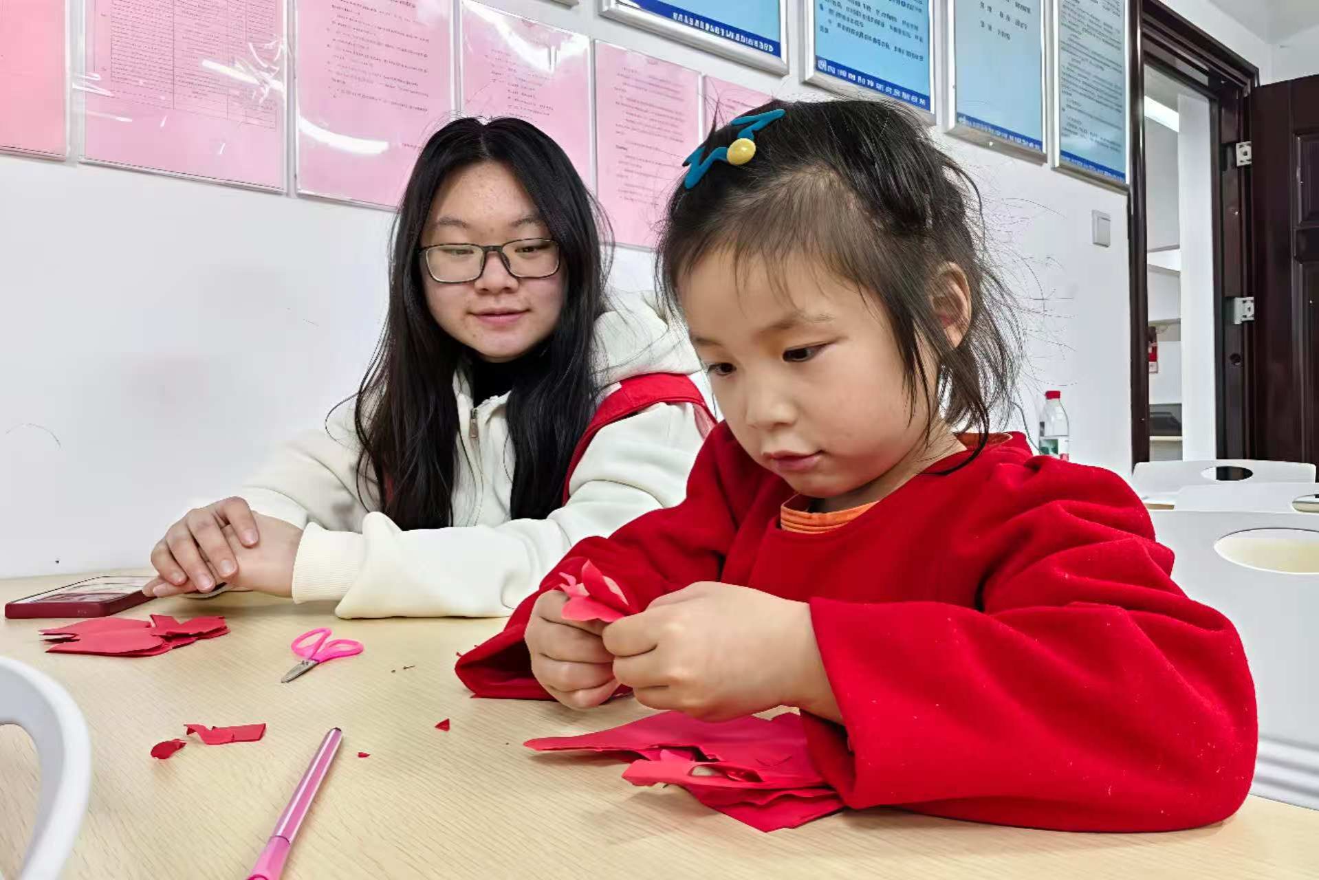 志愿者与小朋友们共同剪纸
