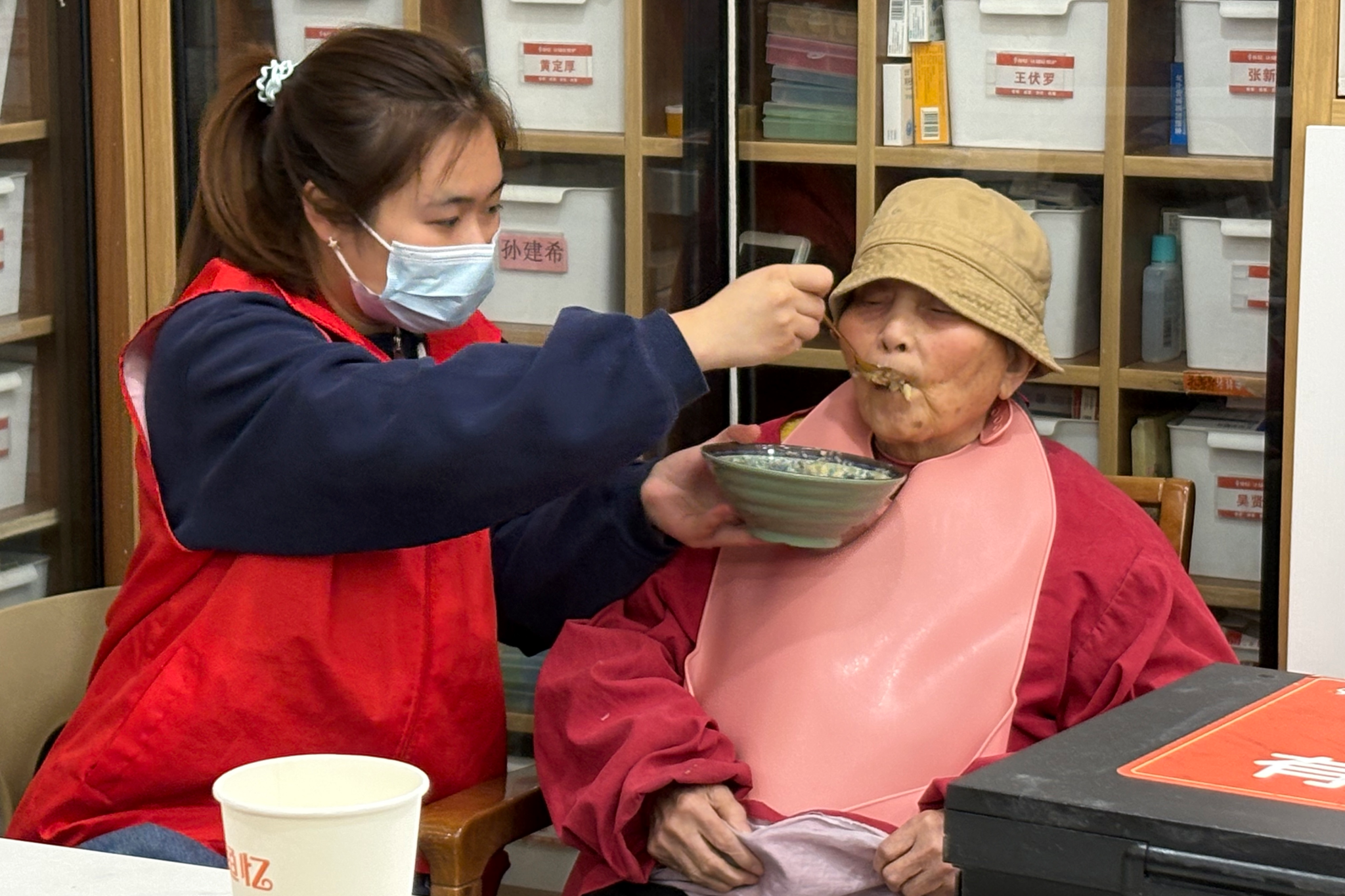志愿者辅助老人进食