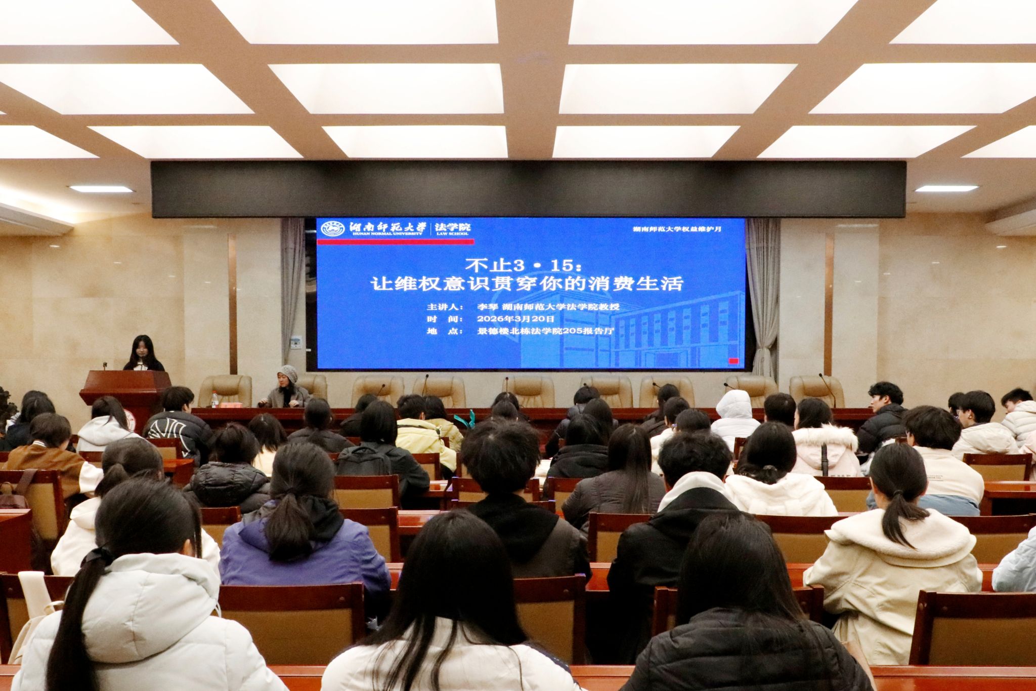 此次讲座是湖南师范大学2026年权益维护月系列活动的子活动之一。系列活动以“权益有声·青春同行”为主题,通过知识普及与案例讲解相结合的方式,引导学生树立理性消费观念、掌握依法维权技能,切实提升学生权益意识,营造安全、诚信的校园环境。