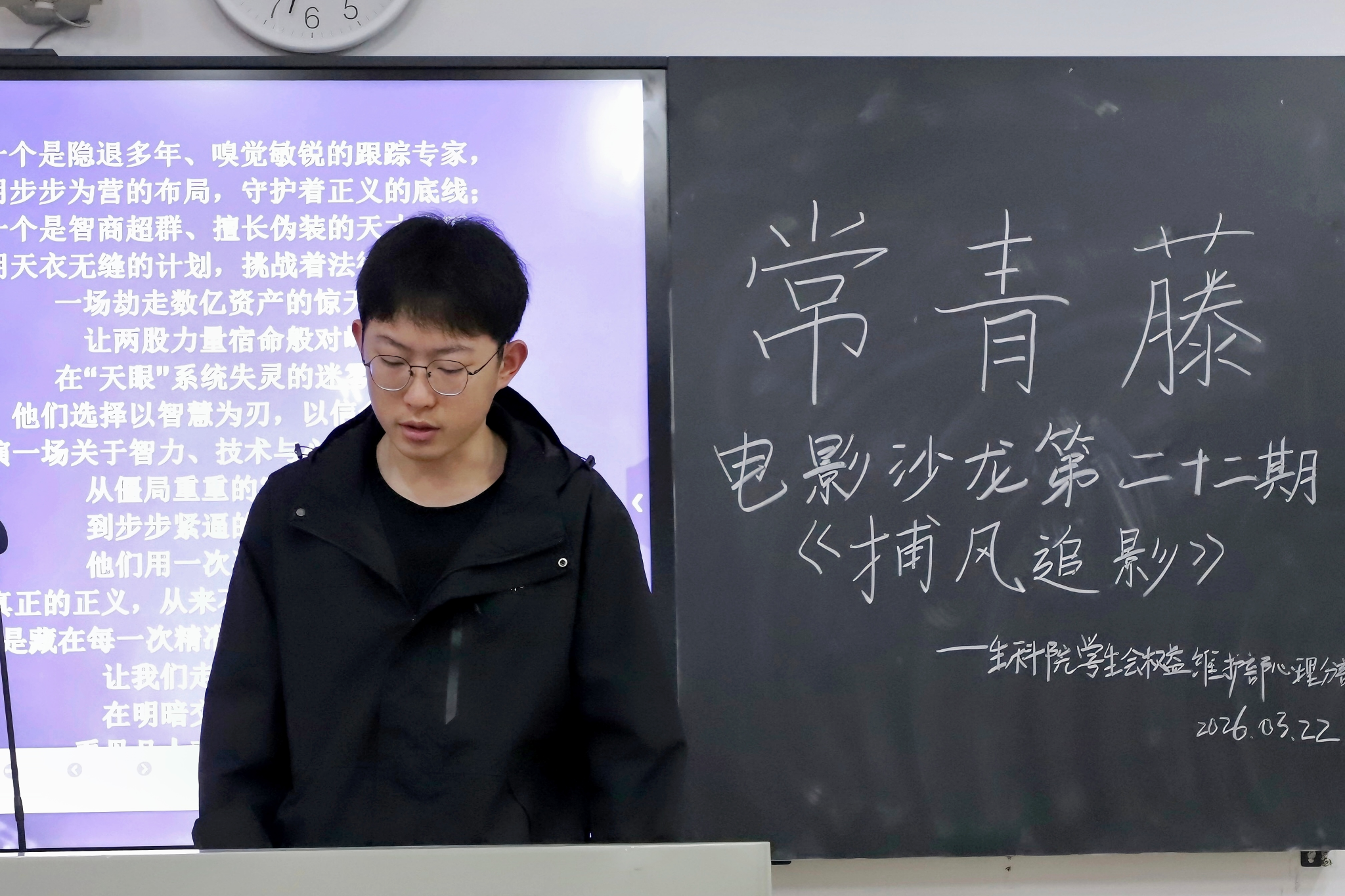 (通讯员 贾天成 谢碧瑶)3月22日晚,生命科学学院于生科院三号楼B108教室举办“常青藤”影院心理电影沙龙第二十二期观影活动。学生会权益部干事黄鹏杰担任此次活动主持人,生科院2023级、2024级、2025级部分本科生参加此次活动。