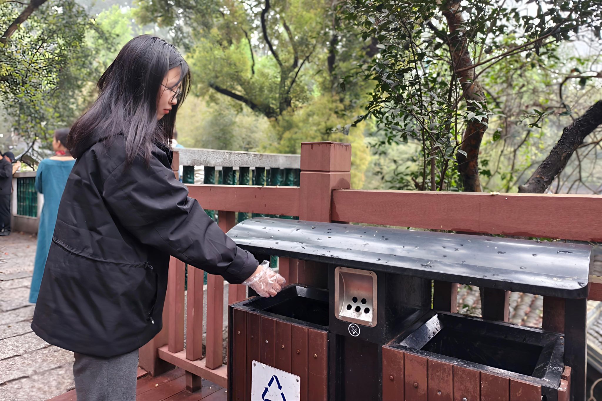 活动前期,绿协理事负责提前观察天气预报,规划登山时间,并预购清扫岳麓山必备的垃圾袋、手套等物品,为清扫岳麓山活动作准备。进入实践环节后,绿协理事运用过往多项志愿服务活动积累的经验,指导志愿者进行垃圾的清理与分类。在明确分工的基础上,志愿者们通力合作,由“被服务者”转变为“服务提供者”。他们手持垃圾袋,从石阶缝隙、林间小径中将散落的烟头、纸屑、塑料瓶一一拾起,并分类归置于回收点。全体志愿者以实际行动践行垃圾分类原则,助力岳麓山自然环境保护。活动尾声,全体志愿者于岳麓山脚下合影留念。