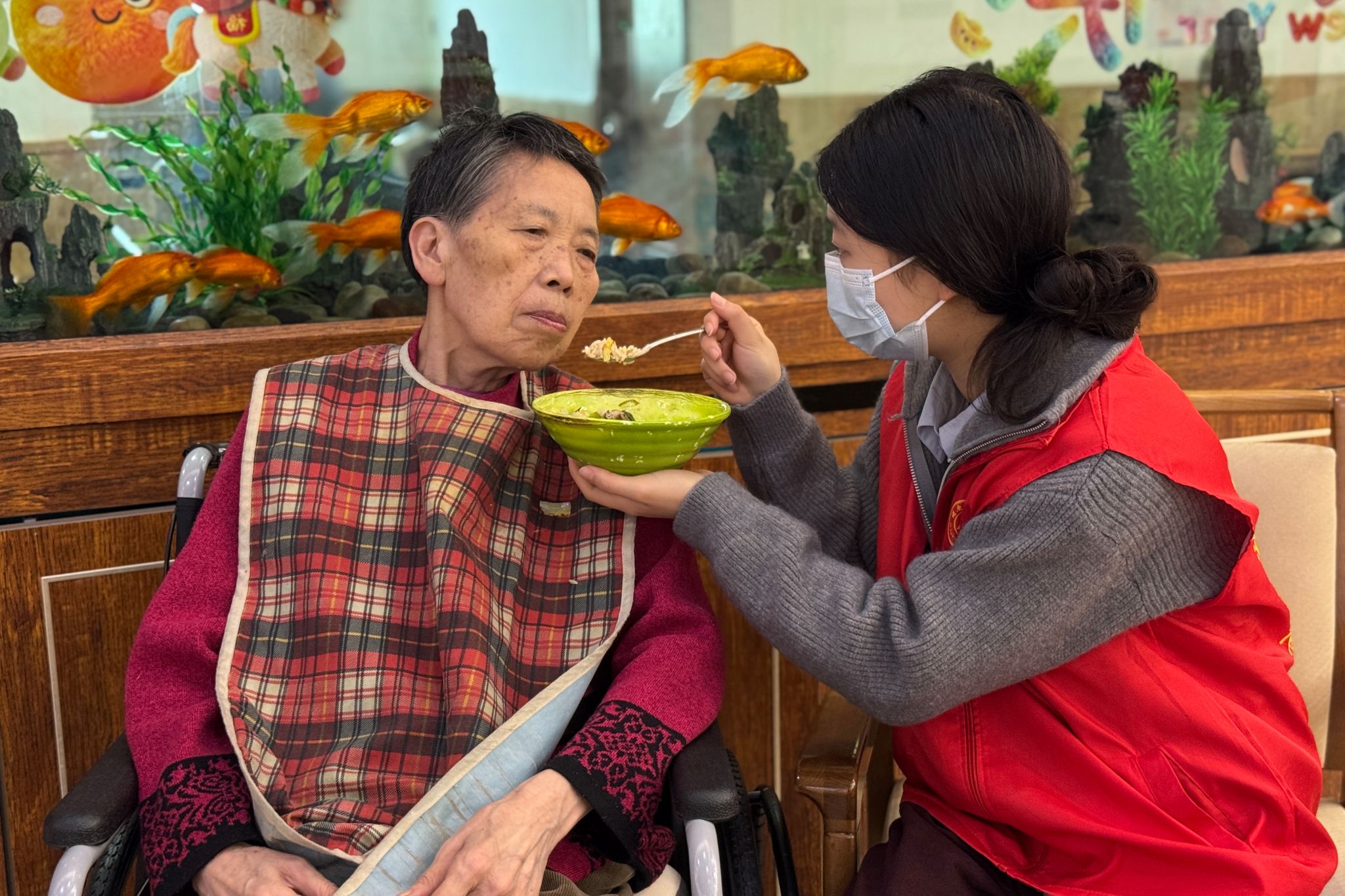 志愿者辅助老人进食