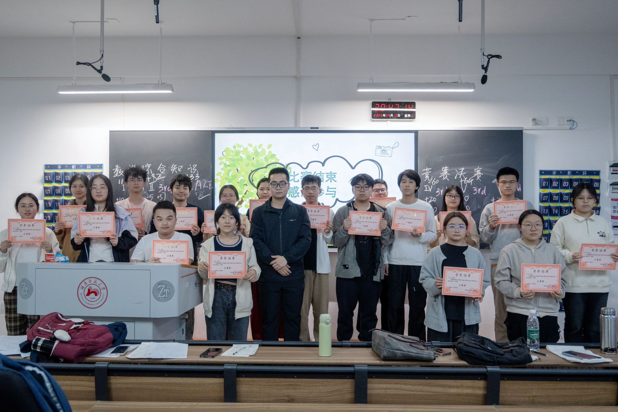 此次活动分为初赛与决赛两个阶段。初赛以笔试形式进行,阅卷的数协理事们根据卷面成绩选拔出决赛人员,随后,学生们自由组队,三人一组参与决赛。决赛设置必答题、抢答题和风险题三个环节。主持人依次介绍竞赛规则与奖惩制度,其中风险题考验选手的心理素质与团队决策能力,各小组根据当前得分与团队策略选择相应分值的题目作答,部分小组在落后的情况下敢于挑战高分值题目并成功反超。抢答题则涵盖数学史、趣味逻辑题及实际应用题,以此考察学生们的知识广度。此外,在必答题环节,小组成员之间分工协作、相互补充,在规定时间内完成一套数学试卷,并由数协理事现场评阅,确定最终得分。活动末尾,全体人员合影留念。