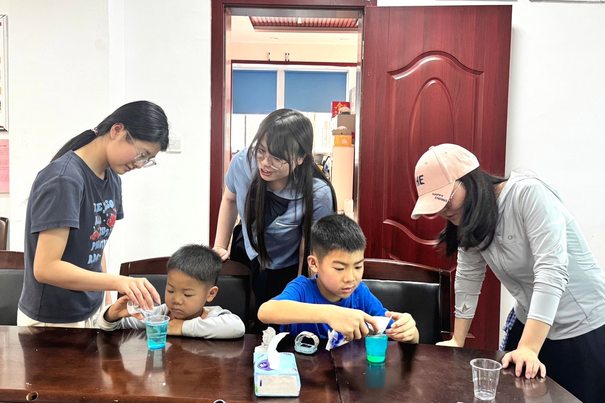 实验开始前,志愿者检查了所有器具的密封性,并分装好试剂。实验过程中,志愿者在旁协助控制用量、提醒安全事项。当有小朋友举手询问颜色变化的原因时,主讲人现场解释了氧化还原反应的原理。实验结束后,小朋友依次将使用过的滴管放回指定位置,会员与小朋友合影留念。