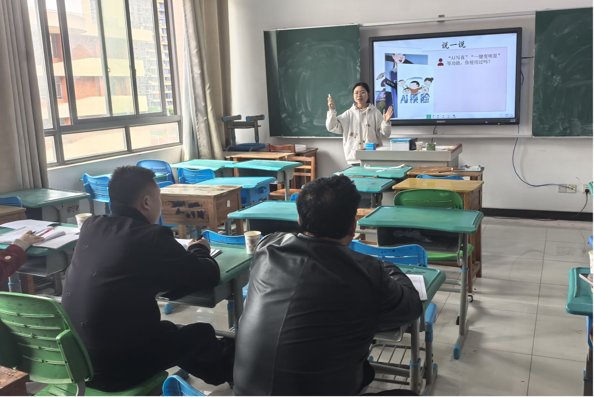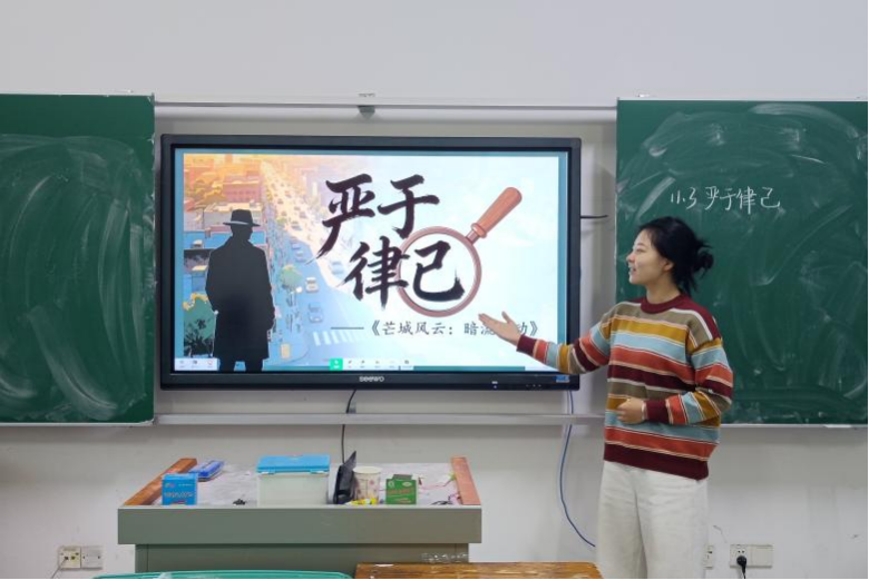 六位实习队员依次进行8分钟片段教学展示。授课过程中,队员们围绕七年级道德与法治第四单元“生活在法治社会”设计教学环节,展示了专业基础与教学素养。授课结束后,评委团回避选手,闭门沟通,最终确定杨一诺、康依琳作为实习队代表承担公开课授课任务。