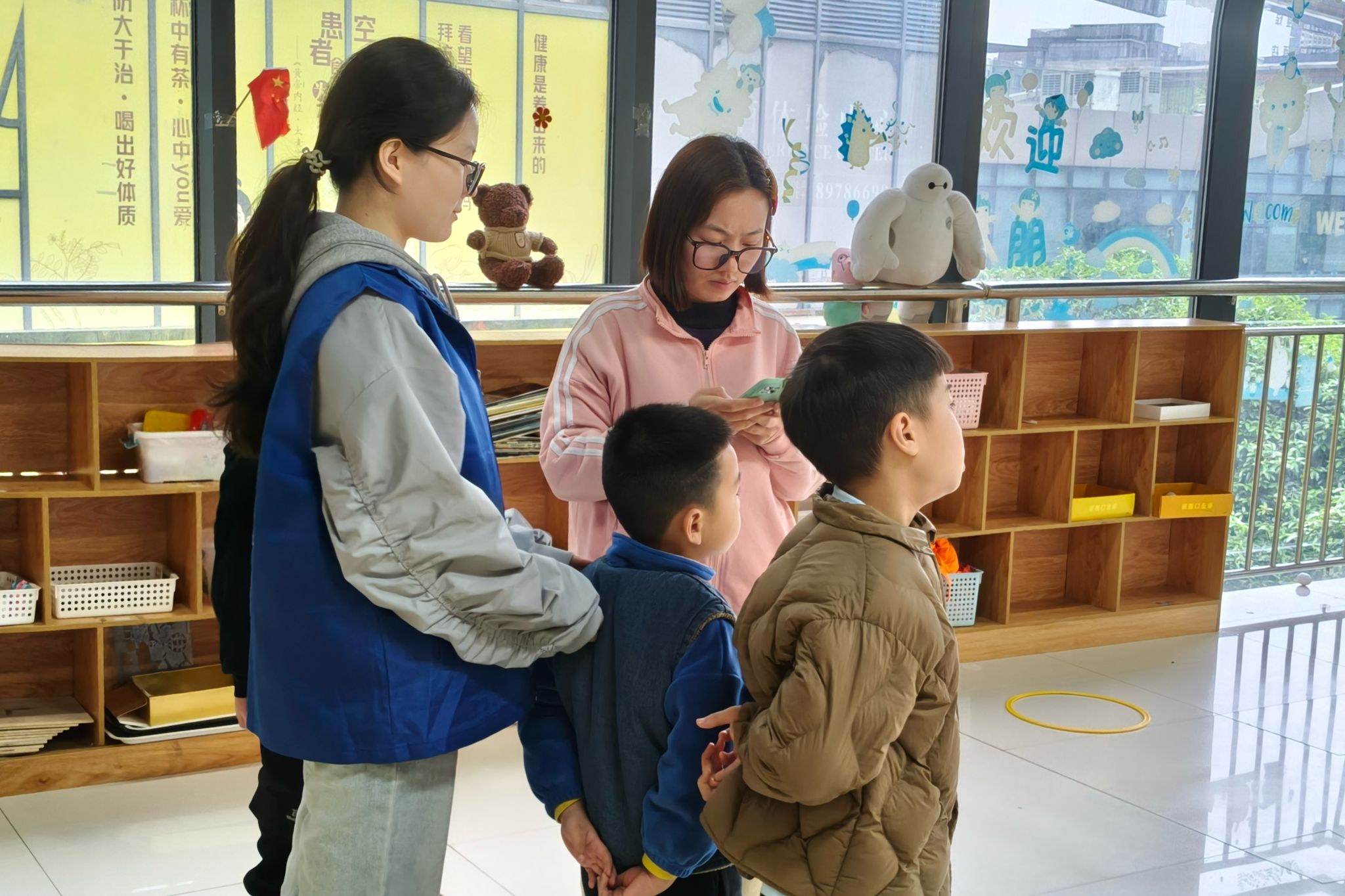 儿童在志愿者的引导下依次排队