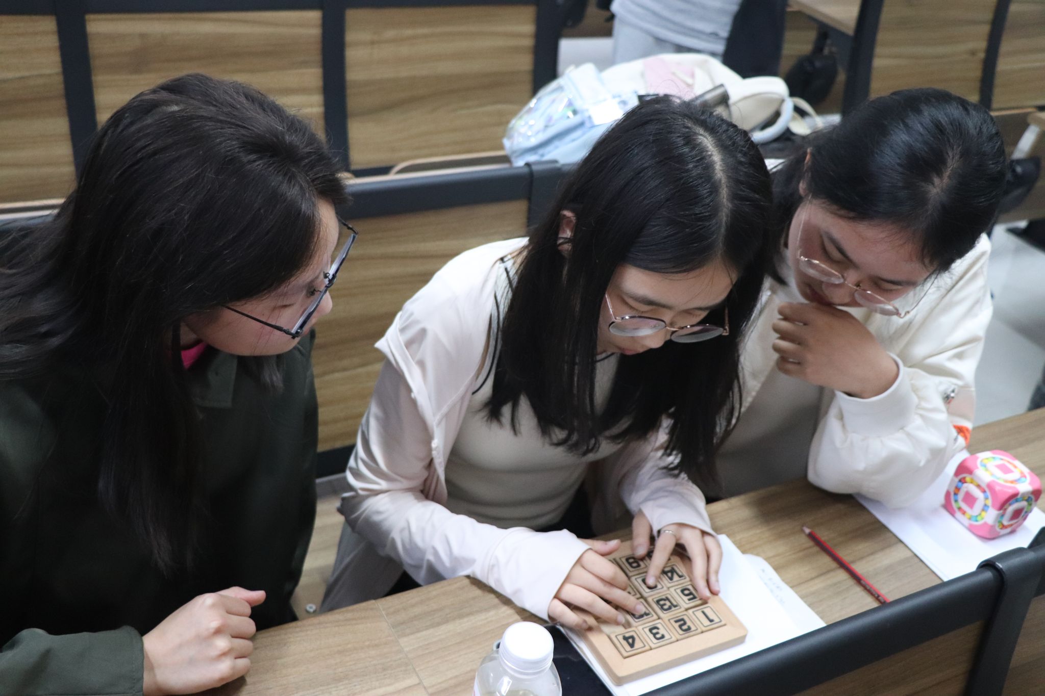 决赛以团队形式开展,晋级选手组成六支队伍,围绕“贯穿项目”、“记忆、速度1v1”、“小组接力赛”以及“齐心协力”四大环节展开比拼。其中,在“贯穿项目”环节中,选手们通过数字游戏APP搭建立体图形,展现空间想象能力。“齐心协力”环节则分为两个阶段,第一阶段结束后根据前期总积分淘汰三支队伍,剩余队伍参与第二阶段的轨道搭建与拼图挑战,共同角逐第一名。赛后,数协理事计算各队所得总积分并公布获奖队伍。获奖参赛者领取奖状后合影留念。