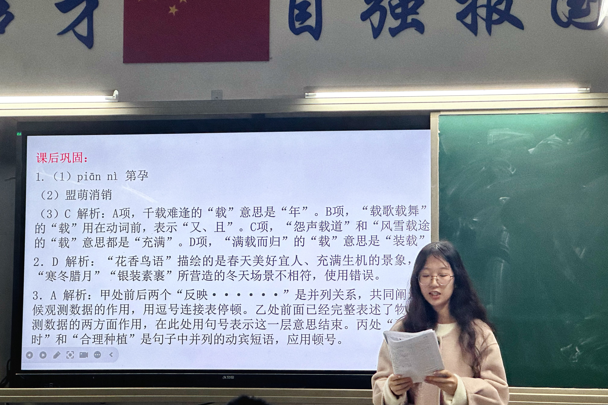此次习题讲解活动帮助实习队员进一步熟悉中学语文习题讲解模式,积累了把握课堂节奏、了解学生学情等相关经验。实习队队员能够从中为后续提升教学质量、完善教学细节奠定基础。