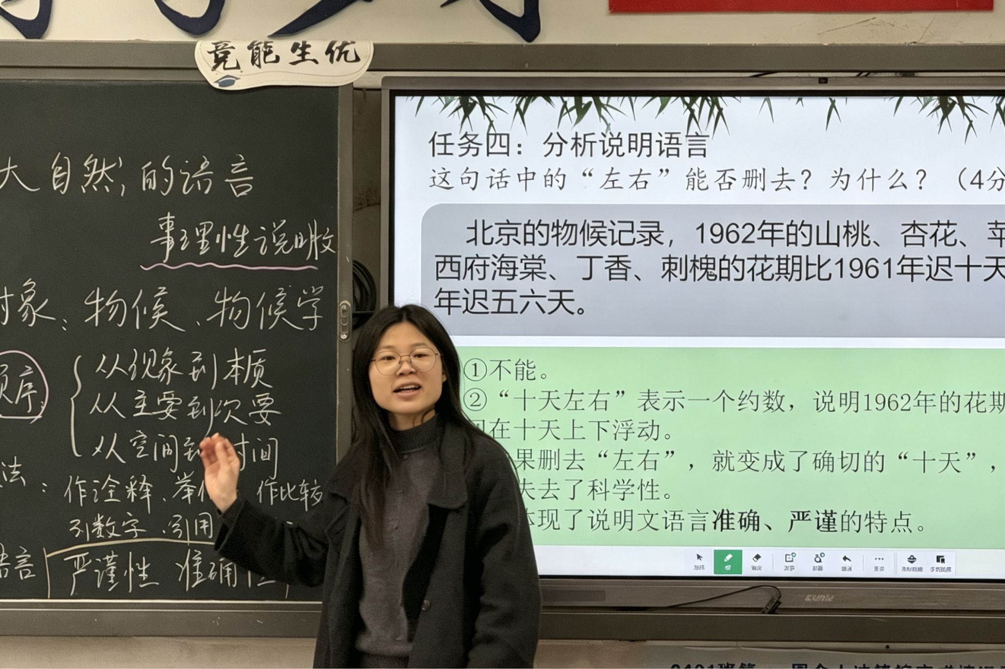 此次授课中,实习队员分别在2401班讲授《大自然的语言》,在2403班、2404班、2406班、2410班、2412班讲授《时间的脚印》,在2405班讲授《恐龙无处不有》。授课期间,实习队员采用启发式教学,通过情境创设、小组讨论等方式引导学生理解文本。各班学生围绕课文的核心问题展开讨论,实习队员根据课堂反馈及时地调整提问与引导方法。